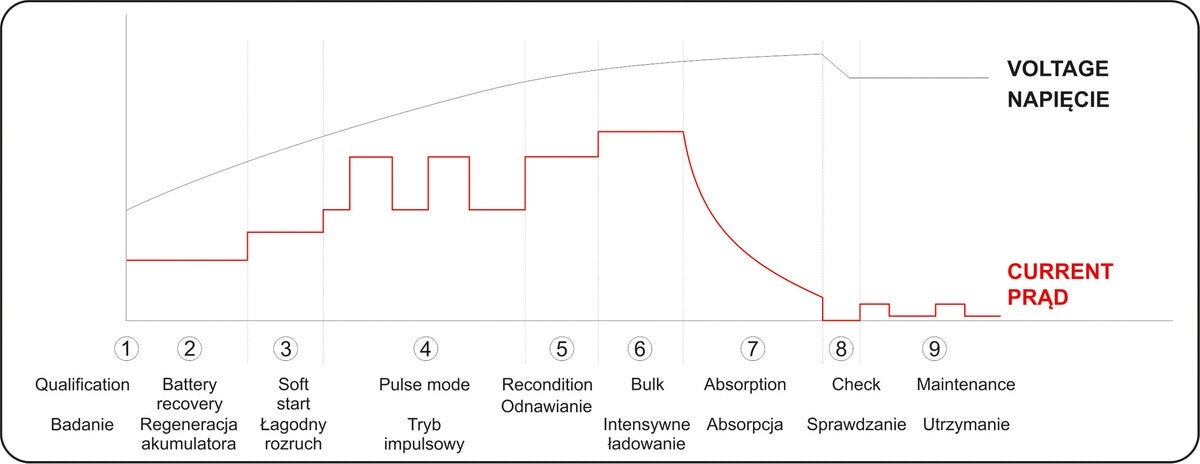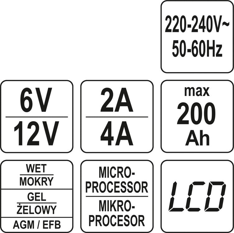 Profesionalus universalus aukšto dažnio mikroprocesorinis pakrovėjas YATO YT-83000 - tai PRO klasės prietaisas, skirtas motociklų, lengvųjų automobilių, mikroautobusų, traktorių ir motorinių valčių akumuliatorių įkrovimui. Palaikomojo krovimo funkcija. Tinka tradiciniams švino-rūgštiniams (flooded battery), geliniams (gel battery), AGM (Absorbent Glass Mat) ir EFB (Enhanced Flooded Battery) tipų akumuliatoriams. EFB akumuliatoriai naudojami automobiliuose su įdiegta Start-Stop technologija. Patogus LCD ekranas. Prietaisas turi apsaugą nuo trumpojo jungimo ir akumuliatoriaus perkrovimo.