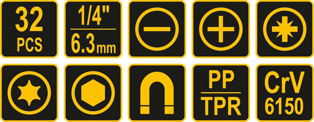 5 x 1/4" TORX tipo (žvaigždė) antagaliai: T10 | T15 | T20 | T25 | T30 | CrV 6150