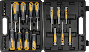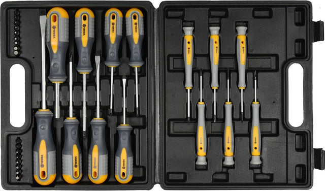 DIY klasės atsuktuvai VOREL 60785 su ergonomiškomis neslystančiomis rankenomis pagaminti iš kokybiško chromo vanadžio [CrV6150] įrankių plieno. Rankenos pagamintos iš polipropileno [PP] ir termoplastinės gumos [TPR]. Matinė apdaila. Įmagnetinti antgaliai. Į gaminio komplektaciją taip pat įeina preciziniai atsuktuvai. Įrankiai pateikiami patogiame ir tvirtame lagamine.