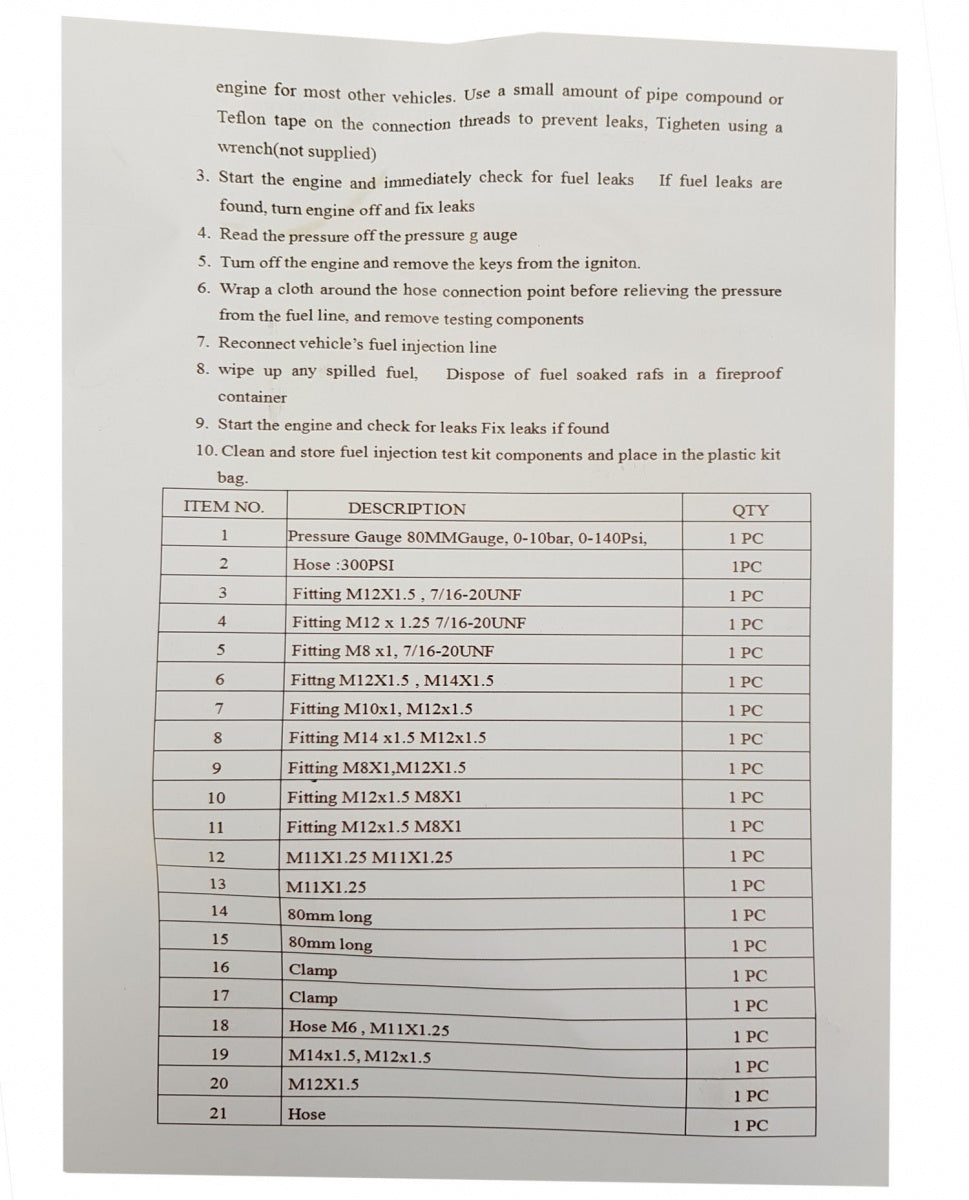 Item size:49*8*3.5cm Carrying Case size:36*26*7cm Gauge Calibration: 0-140 PSI (0-10 Bar) Adapter Sizes: M10 / M12 / M14 Condition: 100% Brand New Package Includes: Pressure Gauge Tester Kit with Carrying Case Includes a variety of hoses, fittings, and clamps