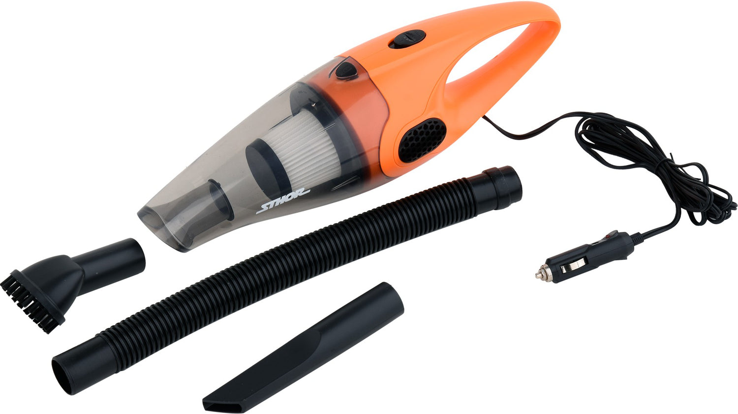 Automobilinis cikloninis dulkių siurblys STHOR 82952 komplektuojamas su 38cm ilgio lanksčia žarna, siurbimo antgalių komplektu ir pateikiamas patogiame medžiaginiame STHOR krepšyje.