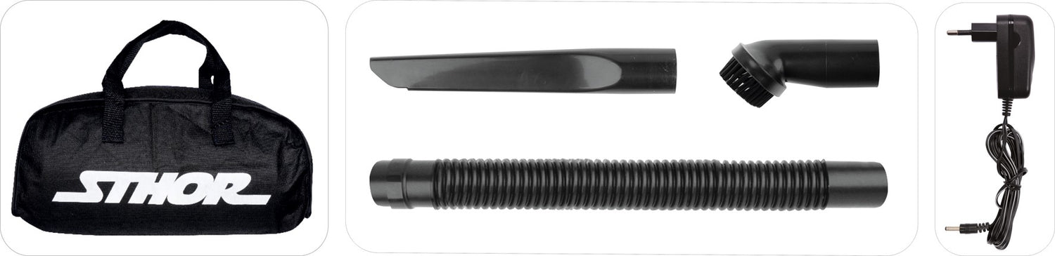 Automobilinis belaidis cikloninis dulkių siurblys STHOR 82954 komplektuojamas su įkrovikliu, 38cm lanksčia žarna, siurbimo antgalių komplektu ir pateikiamas patogiame medžiaginiame STHOR krepšyje.