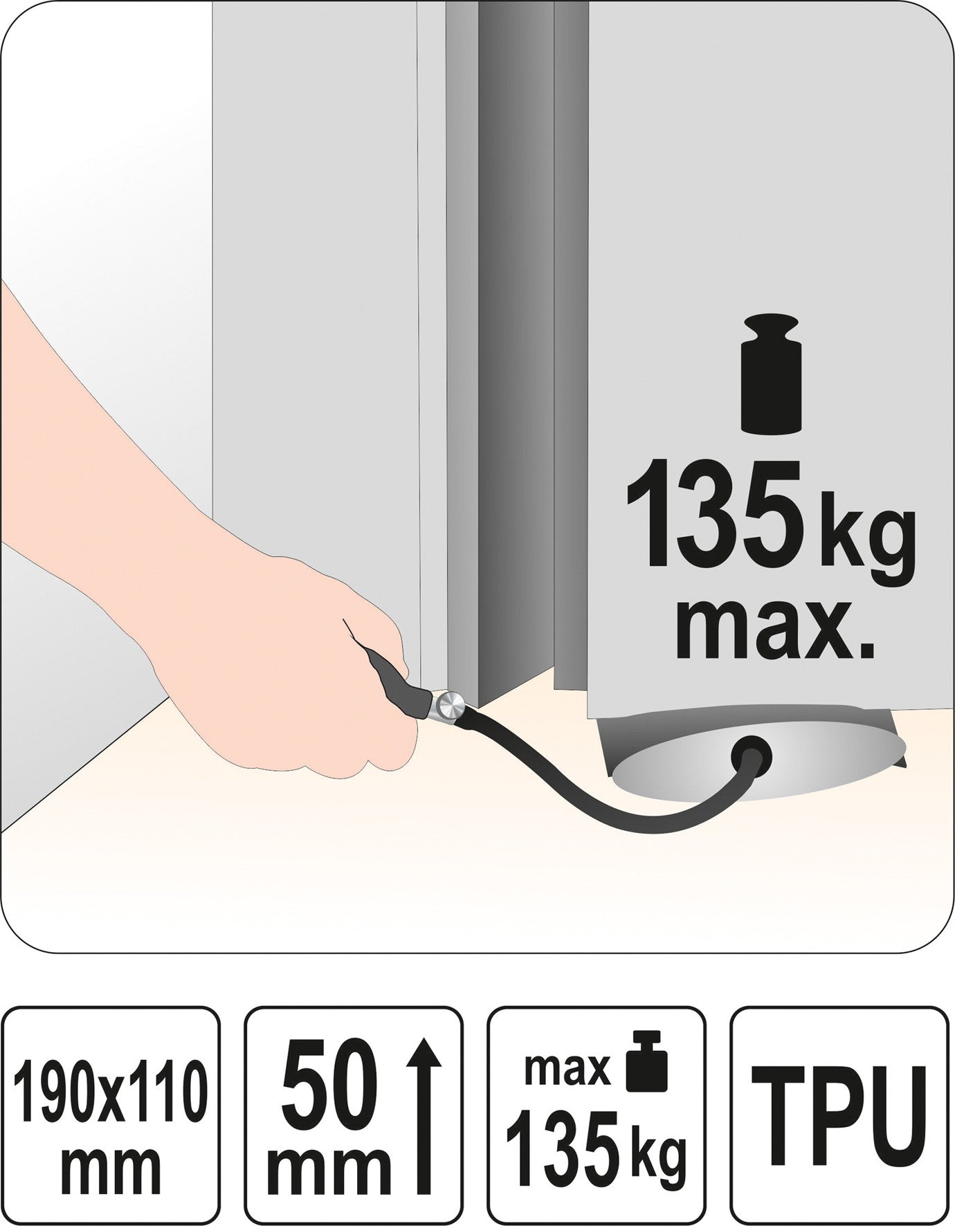 For the positioning of heavy workpieces weighing up to approx. 135 kg. It allows you to easily move / lift, move, level / e.g. furniture, window or door frames, washing machines, refrigerators, parts and devices for various technical works.