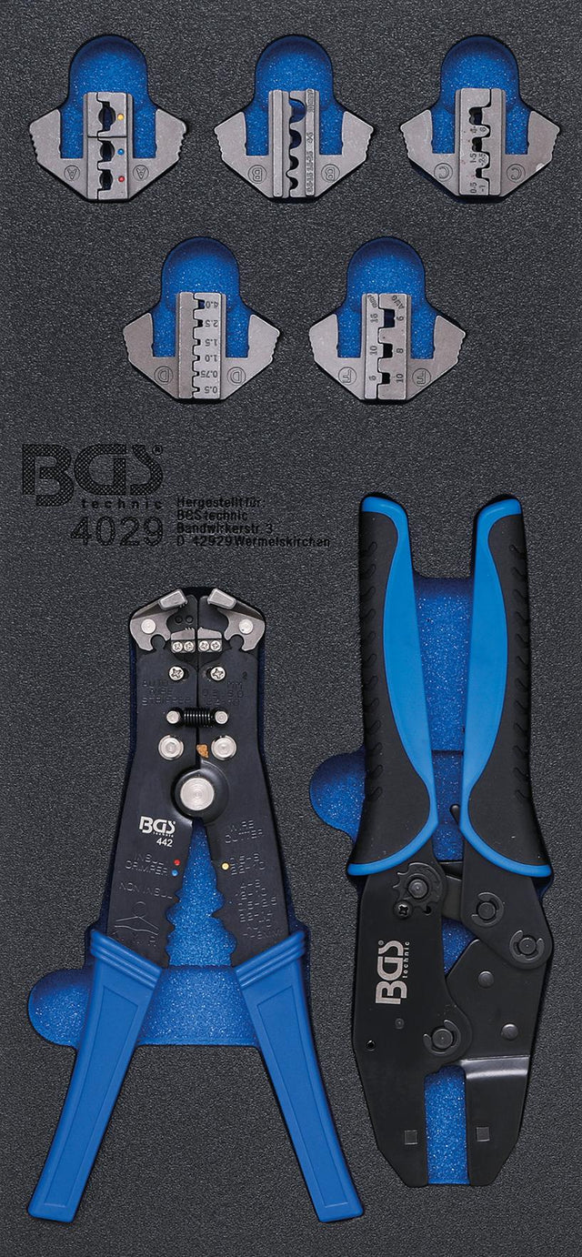 Įrankių dėkle BGS Technic 4029 sukomplektuotos PRO+ klasės antgalių (kontaktų) presavimo replės su keičiamų žiaunų komplektu ir automatinės laidų nužievinimo replės. Toliau pateikiami dydžiai pagal AWG (American Wire Gauge), DIN (Deutsches Institut für Normung) ir JIS (Japanese Industrial Standards) sistemas: