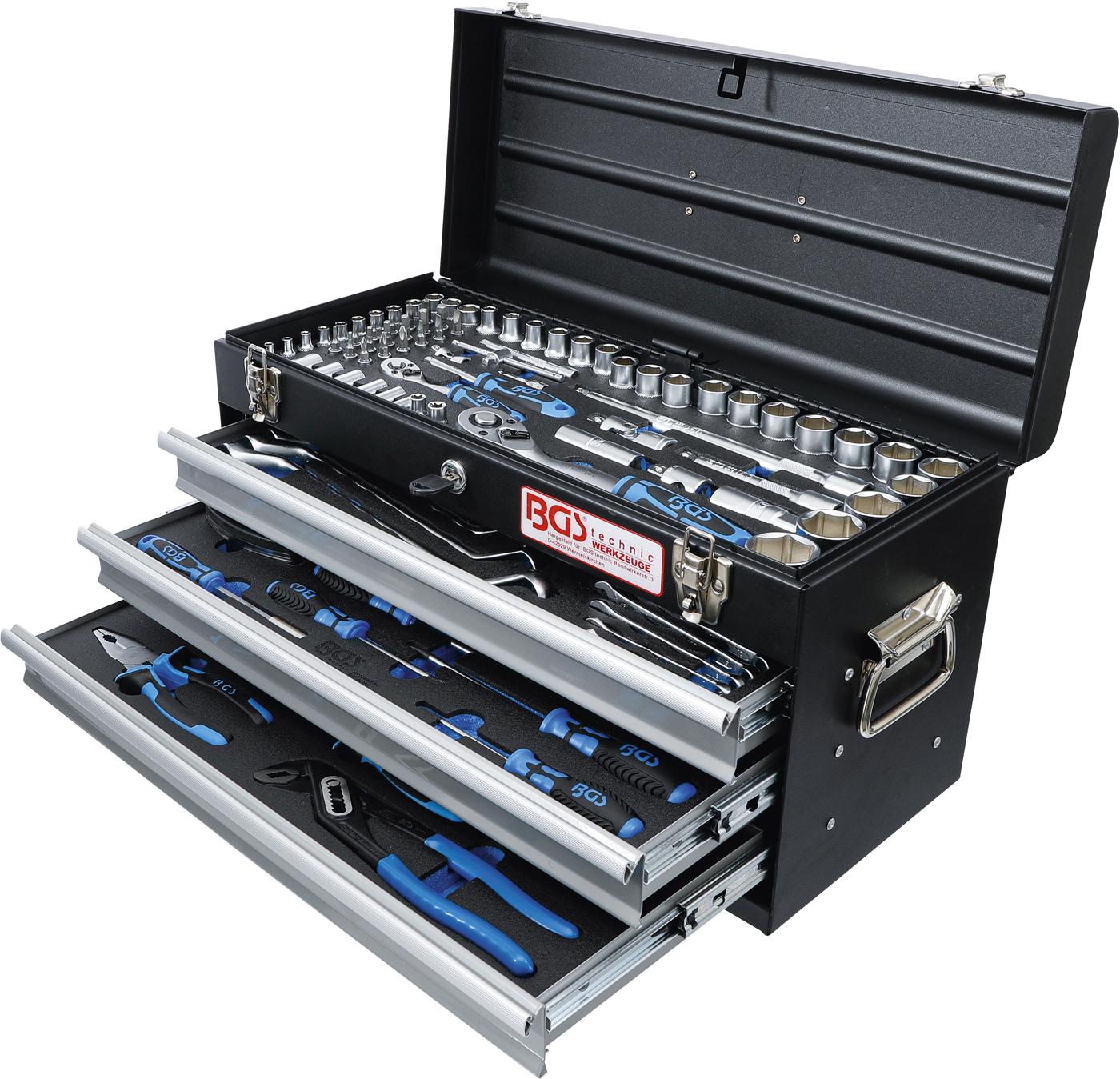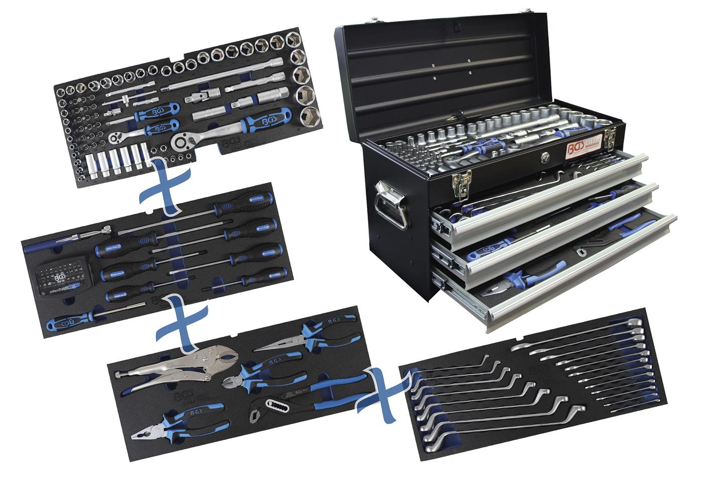 1 x rakinama metalinė įrankių dėžė BGS Technic 3312 | viršutinis skyrius + 3 stalčiai | 535x290x240mm | 10550g | skyriaus matmenys: 515x215x90mm | stalčių matmenys: 500x200x45mm