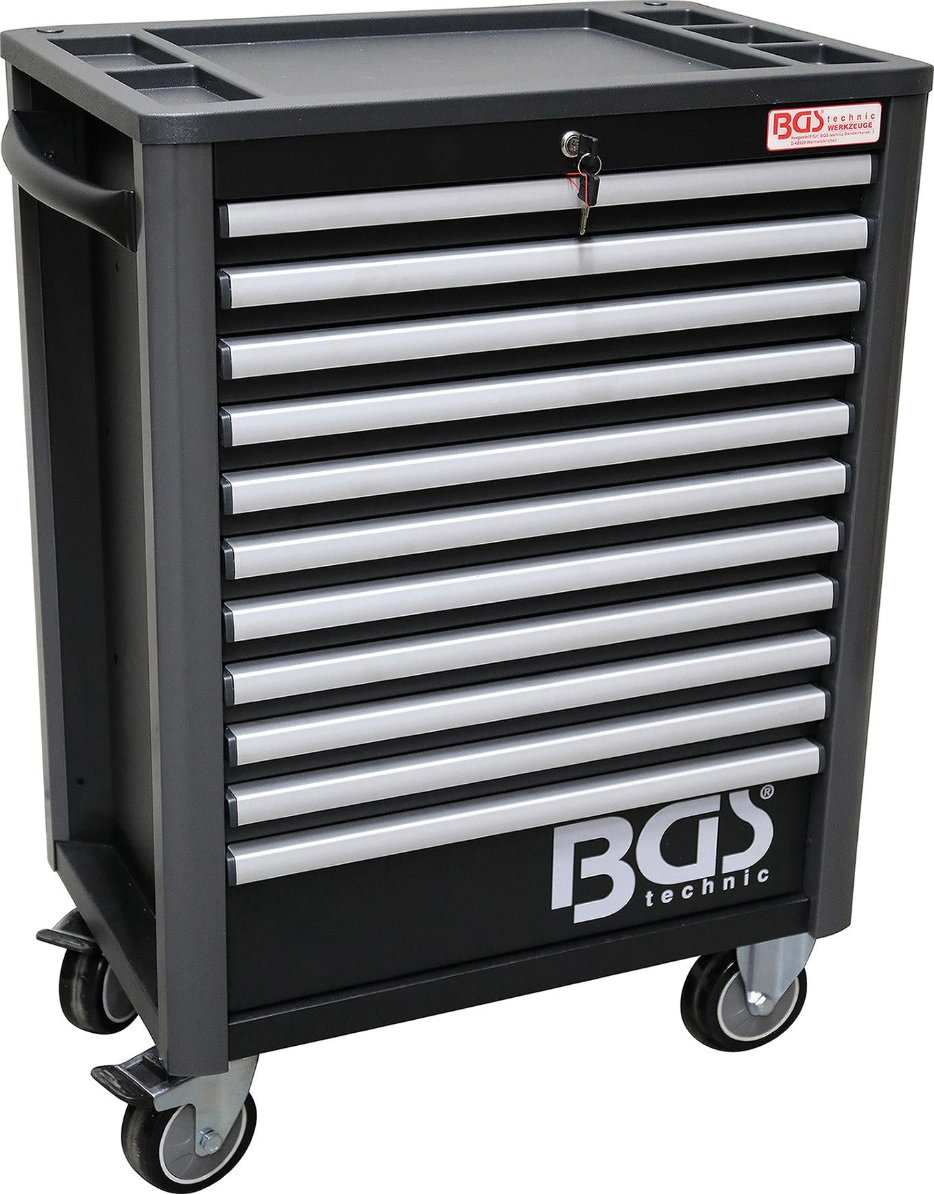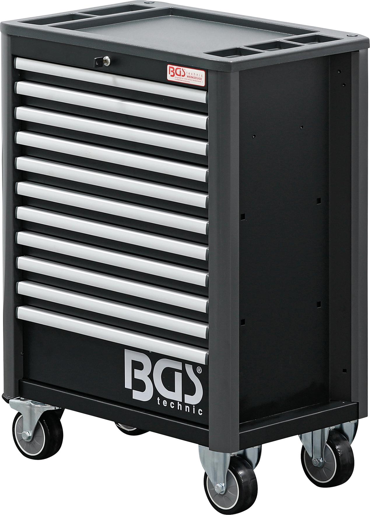 PRO+ klasės BGS Technic 4103 įrankių spintelės išoriniai matmenys 724x470x1033mm. Korpuso sienų storis - 1.2mm, stalčių sienų - 0.8mm. Patogus 5 skyrių stalviršis. Spintelėje yra 11 pilnai ištraukiami stalčių, sumontuotų ant rutulinių (guolinių) bėgelių. Stalčių išmatavimai: 569x409x54mm (10vnt.) ir 569x409x170mm (1vnt.). 1-10 stalčių maksimali apkrova 20kg, 11 stalčiaus - 30kg, stalviršio - 50kg. Rakinama centriniu užraktu. Spintelė turi 2 šonines lentynėles, kurių išmatavimai 78x370x75mm. Spintelė montuojama ant 4x125mm ratų, iš kurių 2 - su stabdžiais. Turi patogią šoninę rankeną.