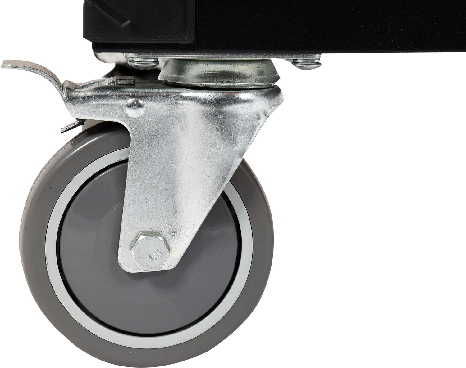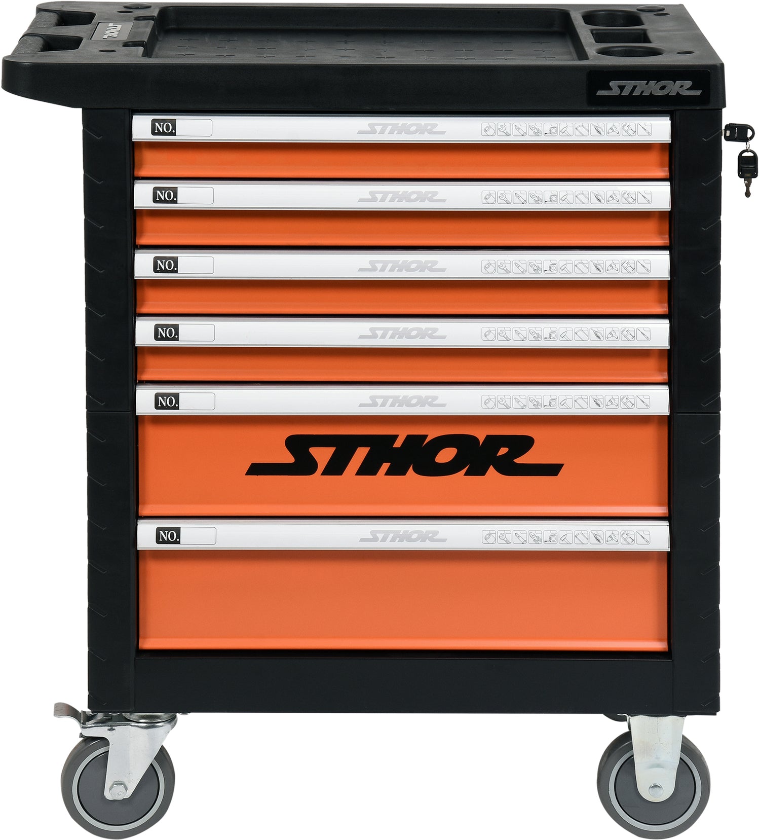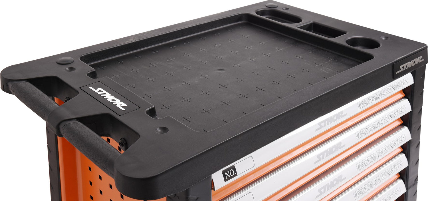 DIY+ klasės STHOR 58550 įrankių spintelės neslystančiu polipropileno stalviršiu išoriniai matmenys 901x770x458 mm, pagaminta iš dvigubo lakštinio plieno. Spintelėje yra 6 stalčiai, sumontuoti ant rutulinių (guolinių) bėgelių. 3 viršutinių stalčių maksimali apkrova 25 kg, 3 apatinių - 35 kg. Rakinama centriniu užraktu, o kiekvienas stalčius taip pat gali būti užrakinamas atskirai. Komplekte yra 2 raktai. Spintelės kampai - su guminėmis apsaugomis, apsaugančiomis nuo netyčinių pažeidimų darbo vietoje, pvz., automobilio kėbulo subraižymo. Montuojama ant 4 guminių (PVC) 125mm ratų, iš kurių 2 - su stabdžiais. Perforuotos spintelės sienos leidžia primontuoti kitus norimus elementus.