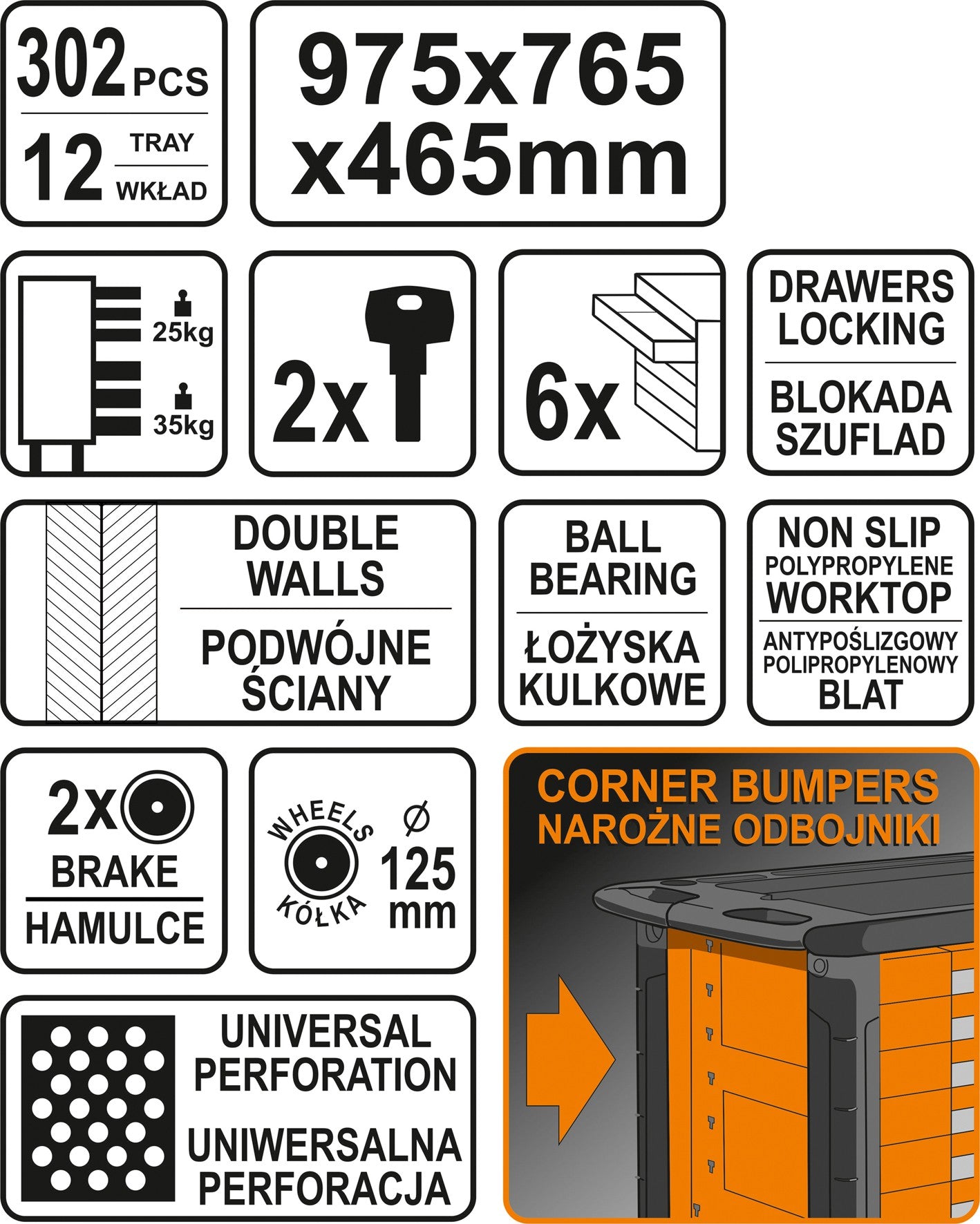 Spintelė sukomplektuota su 12 STHOR įrankių dėklų, išdėstytų 4 stalčiuose. Iš viso, rinkinį sudaro 302 įrankiai ir jų dalys. Įrankiai pagaminti iš tvirto chromo vanadžio ir anglinio įrankių plieno (CrV50BV30 | CrV6140 | CrV6150 | AISI S2 | Carbon Steel). Komplekte yra kombinuotų raktų rinkinys, dvigubų lenktų kilpinių raktų komplektas, replių ir atsuktuvų rinkiniai, 1/2", 1/4" ir 3/8" šešiakampių HEX ir TORX galvučių rinkiniai, prailgintuvai, 72 dantų reversiniai terkšliniai raktai su ergonomiškomis neslystančiomis TPR rankenomis, universalios (kardaninės) jungtys ir kiti elementai. AS-Drive sistemos raktai bei galvutės padidina maksimalų sukimo momentą 25% bei negadina veržlių galvučių. Įrankiai atitinka atitinka DIN (Deutsches Institut für Normung - Vokietijos standartizavimo instituto) standartus. Šios konfigūracijos DIY+ klasės įrankių rinkinys tinka surinkimo darbams, automobilių remontui bei kitiems darbams namuose ar dirbtuvėse.