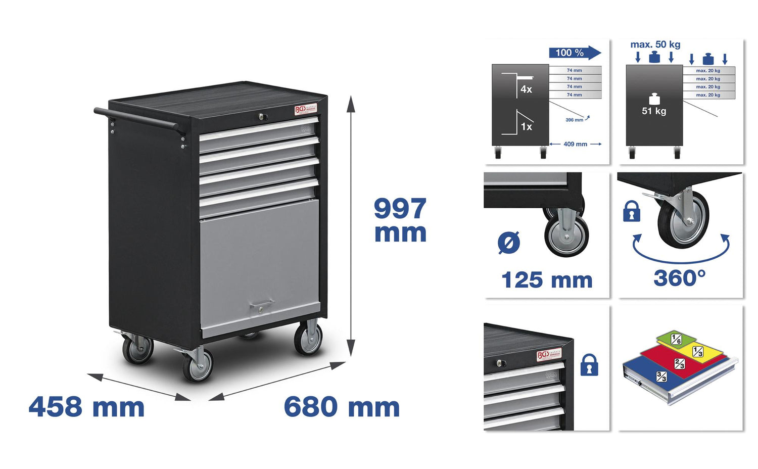 PRO+ klasės BGS Technic 4086 įrankių spintelės Azubi išoriniai matmenys 680x458x995mm. Korpuso sienų storis - 0.9mm, stalčių sienų - 0.7mm. Patogus neslystantis stalviršis. Spintelėje yra 4 pilnai ištraukiami stalčiai, kurių išmatavimai: 569x409x52mm ir 560x395x410mm talus atskirai rakinamas skyrius. Stalčių maksimali apkrova 20kg, skyriaus - 30kg, stalviršio - 50kg. Stalčiai rakinami centriniu užraktu. Spintelė montuojama ant 4 ratukų, iš kurių 2 - pasukami 360 laispnių kampu, o kiti 2 - su stabdžiais. Turi patogią šoninę rankeną.