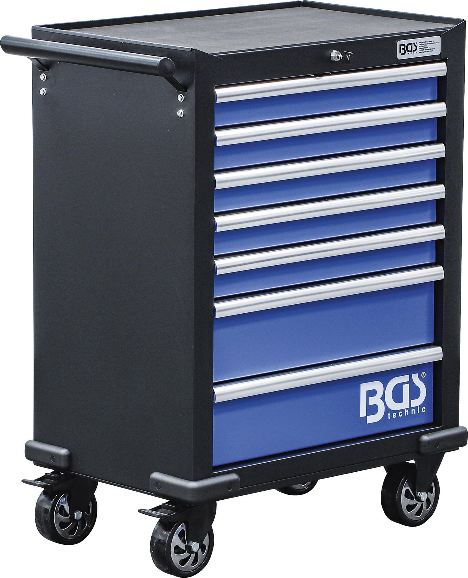 PRO+ klasės BGS Technic 4204 įrankių spintelės iš lakštinio plieno išoriniai matmenys 699x458x994mm. Korpuso sienų storis - 0.9-1.0 mm, stalčių sienų - 0.7-0.8 mm. Patogus ir tvirtas neslystantis stalviršis. Dažyta milteliniu būdu. Spintelėje yra 7 pilnai ištraukiami stalčiai, kurių išmatavimai: 560.4x403.8x59mm (5vnt.) ir 560.4x403.8x138mm (2vnt.). 1-5 stalčių maksimali apkrova 20kg, 6-7 stalčių - 30kg, stalviršio - 40kg. Rakinama centriniu užraktu. Spintelė montuojama ant keturių 125mm ratukų, iš kurių 2 - pasukami su stabdžiais. Turi patogią šoninę rankeną.