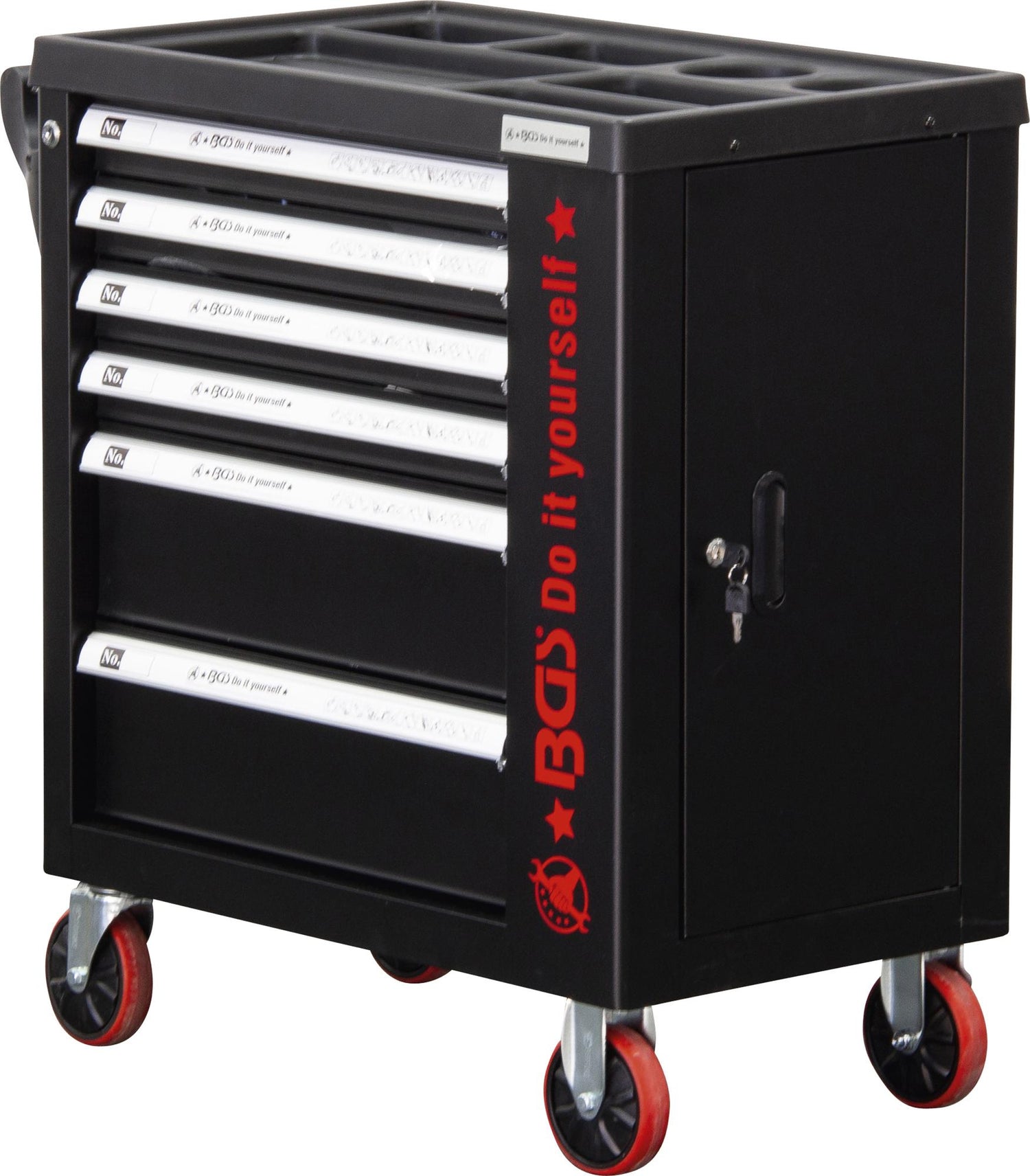 DIY+ klasės įrankių spintelės iš BGS Technic 6055-1 išoriniai matmenys 749.8x455x879.7mm. Patogus stalviršis suskirstytas į 7 skyrius. Spintelėje yra 6 pilnai išsitraukiantys stalčiai ir rakinamas šoninis skyrius. Rakinama centriniu užraktu. Stalčių vidiniai išmatavimai: 505x400x43mm (4vnt.) ir 505x400x155mm (2vnt.). Viršutinių 4 stalčių maksimali apkrova 20 kg, apatinių - 30 kg. Spintelė montuojama ant keturių Ø120mm guminių ratų, iš kurių 2 - su stabdžiais, turi patogią šoninę rankeną.