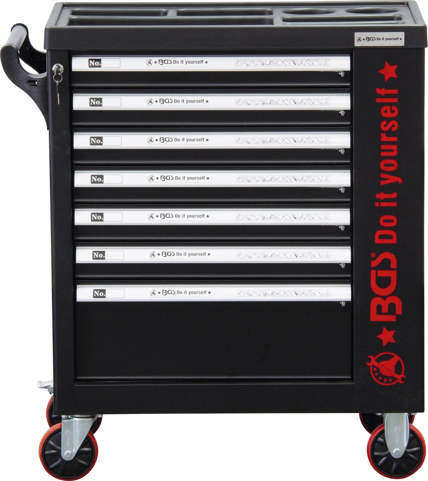DIY+ klasės įrankių spintelės iš BGS Technic 6058-1 išoriniai matmenys 795.1x400x969.7mm. Patogus stalviršis suskirstytas į 7 skyrius. Spintelėje yra 7 pilnai išsitraukiantys stalčiai ir rakinamas šoninis skyrius. Rakinama centriniu užraktu. Stalčių vidiniai išmatavimai: 542x400x70mm (6vnt.) ir 542x400x200mm (1vnt.). Viršutinių 6 stalčių maksimali apkrova 20 kg, apatinio - 30 kg. Spintelė montuojama ant keturių Ø120mm guminių ratų, iš kurių 2 - su stabdžiais, turi patogią šoninę rankeną.