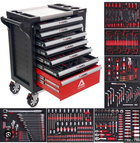Įrankių spintelė ant ratukų | metalinis starviršis | su įrankiais | 7 stalčiai / 1 durelės | 322 įrankiai (H7002) yra užsakomoji prekė, ją išsiųsime per 3-4 savaites.