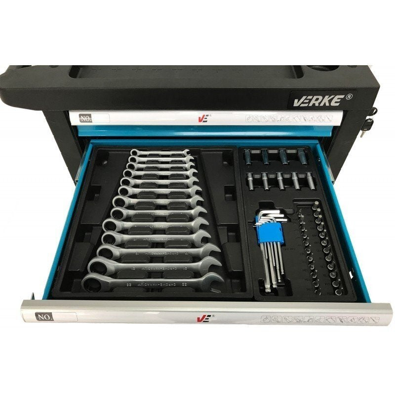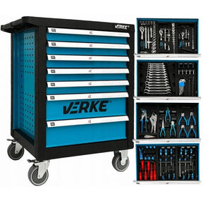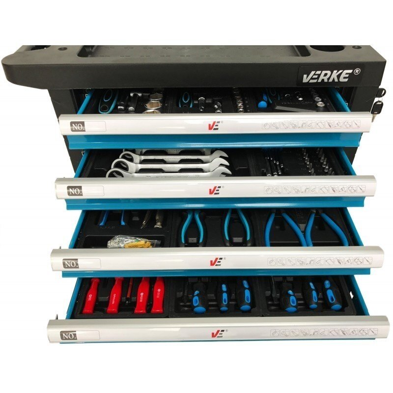 EKO+ klasės VERKE H7005 įrankių spintelės iš lakštinio plieno išoriniai matmenys 766x465x985 mm. Patogus polipropileno stalviršis su integruota ergonmiška rankena. Spintelėje yra 7 pilnai ištraukiami stalčiai ant bėgelių su rutuliniais guoliais, kurių išmatavimai: 545x395x60 mm (5vnt.) ir 545x395x120 mm (2vnt.). Apsaugos nuo smūgių ant visų spintelės kraštinių. Maksimali stalviršio apkrova - 450 kg. Rakinama centriniu užraktu. Spintelė montuojama ant keturių 125mm ratukų, iš kurių 2 - pasukami, o vienas su stabdžiais. Į komplektaciją įeina 11 įrankių dėklų.