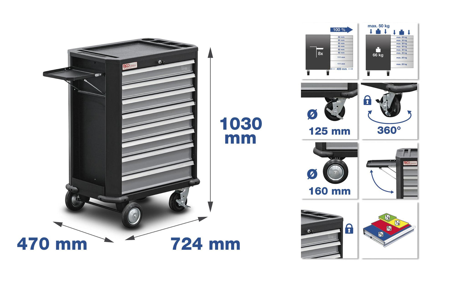 PRO+ klasės BGS Technic 4050 įrankių spintelės išoriniai matmenys 730x480x1035mm. Korpuso sienų storis - 1.0mm, stalčių sienų - 0.8mm. Praktiškas stalviršis su 6 skyriais. Spintelėje yra 8 pilnai ištraukiami stalčiai, sumontuoti ant rutulinių bėgelių, kurių išmatavimai: 569x409x80mm (6vnt.) ir 569x409x110mm (2vnt.). 1-6 stalčių maksimali apkrova 20kg, 7-8 stalčių - 25kg, stalviršio - 50kg. Rakinama centriniu užraktu. Spintelė montuojama ant 4 ratukų, iš kurių 2 - pasukami 360 laipsnių kampu, o kiti 2 - su stabdžiais. Turi atlenkiamą šoninę lentyną ir patogią rankeną.