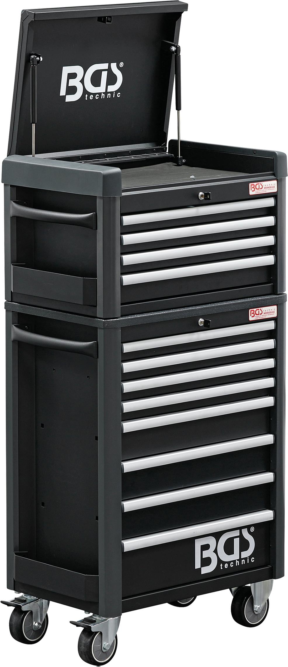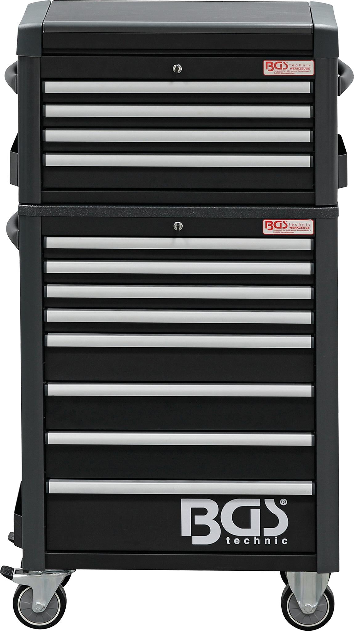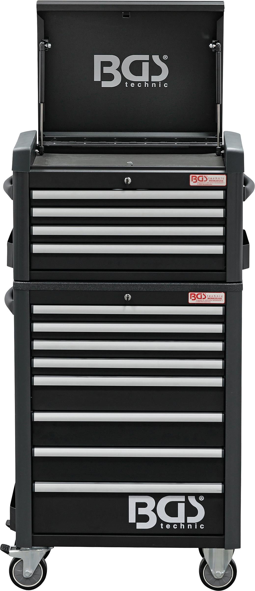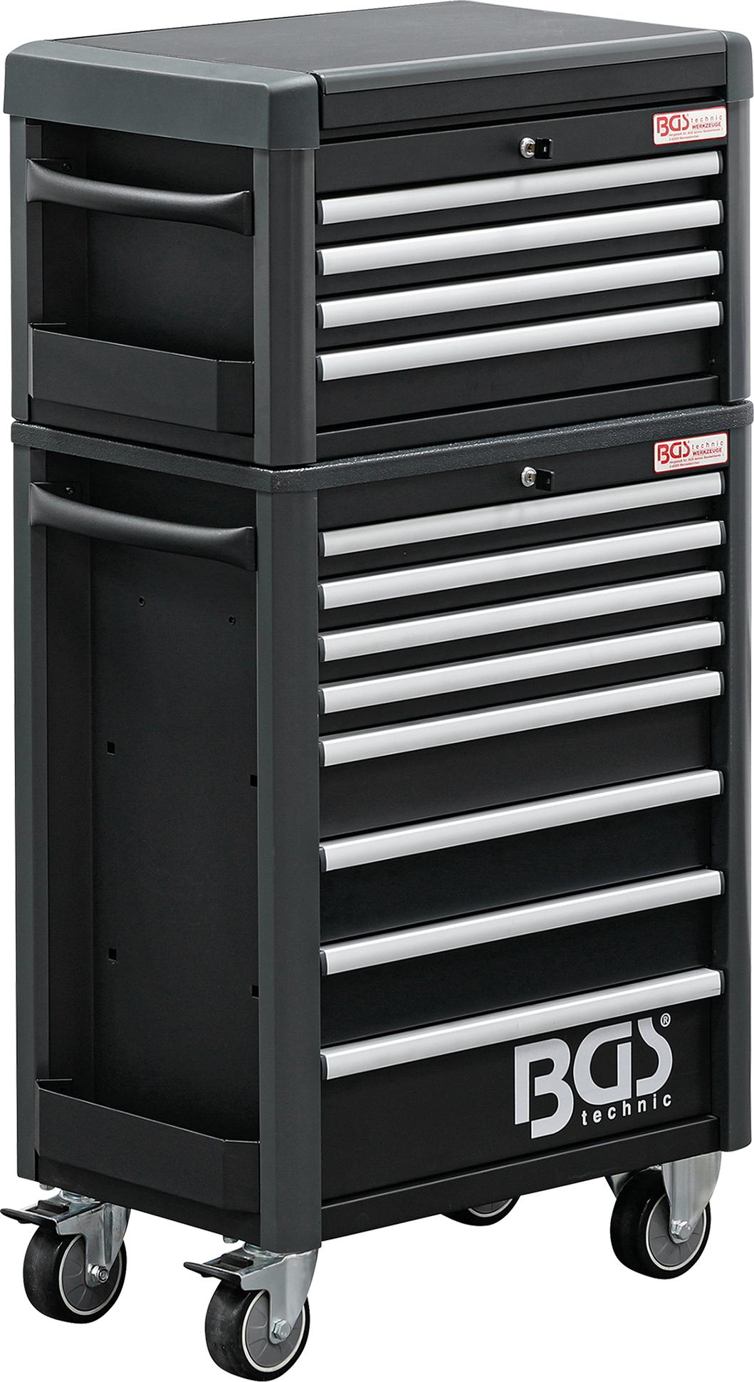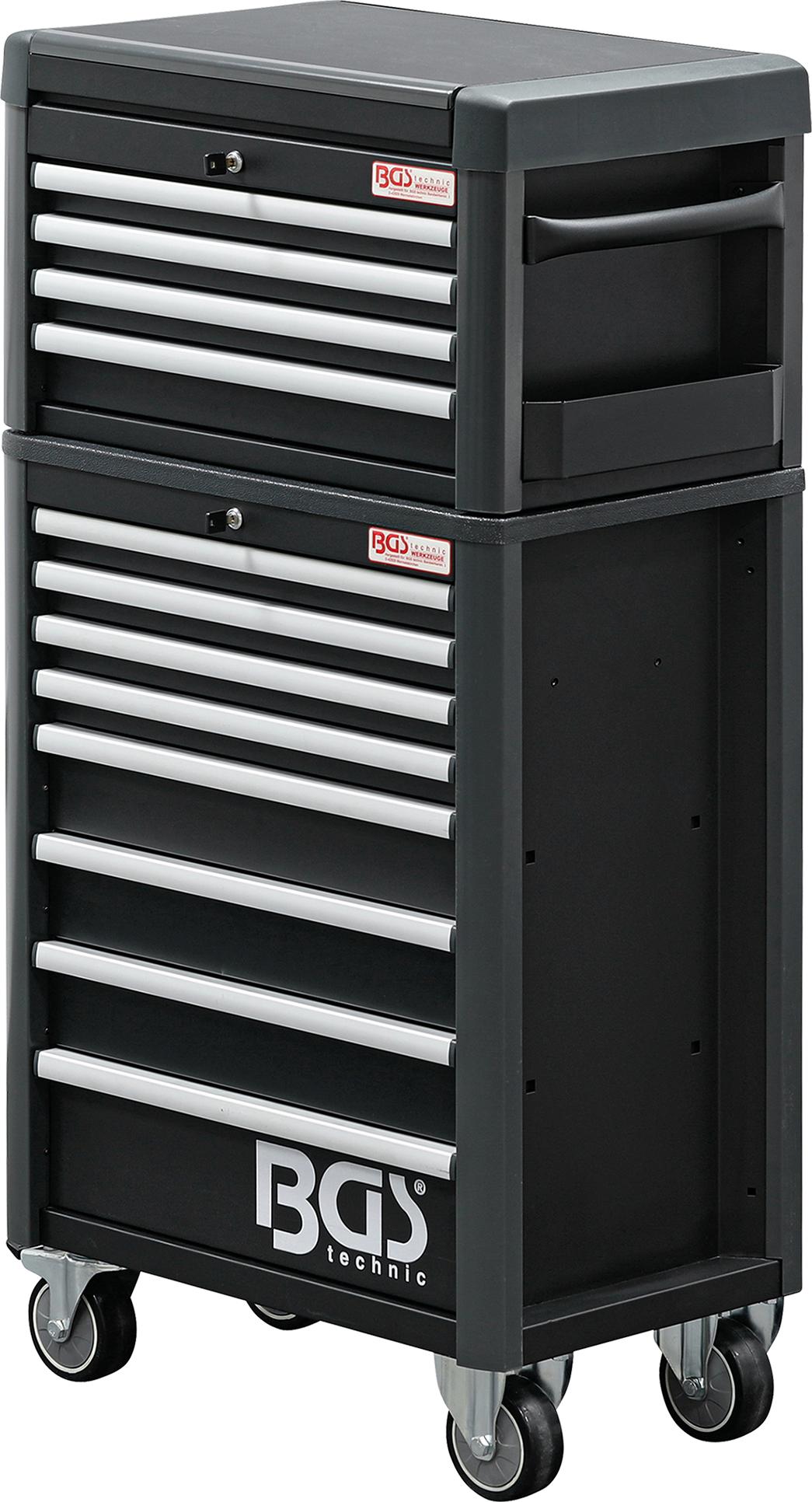 2. BGS Technic 4111 įrankių spintelė, kurios išoriniai matmenys 724x470x1033mm. Korpuso sienų storis - 1.2mm, stalčių sienų - 0.8mm. Patogus 5 skyrių stalviršis. Spintelėje yra 8 pilnai ištraukiami stalčiai, sumontuoti ant rutulinių (guolinių) bėgelių. Stalčių išmatavimai: 569x409x53mm (4vnt.), 569x409x111mm (3vnt.) ir 569x409x169mm (1vnt.). 1-4 stalčių maksimali apkrova 20kg, 5-7 stalčių - 25kg, 8 stalčiaus - 30kg, stalviršio - 50kg. Rakinama centriniu užraktu. Spintelė turi 2 šonines lentynėles, kurių išmatavimai 78x370x75mm. Spintelė montuojama ant 4x125mm ratų, iš kurių 2 - su stabdžiais. Turi patogią šoninę rankeną.