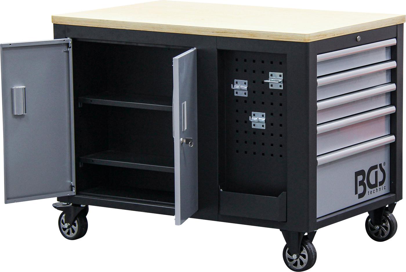 PRO+ klasės BGS Technic 4199 įrankių spintelė pasižymi stabilia ir tvirta konstrukcija, jos išoriniai matmenys 1150x740x866mm. Korpuso sienų storis - 1.0/1.2mm, stalčių sienų - 1.0mm, durelių - 0.8mm, lentynų - 1.0mm. Du skyriai rakinamomis durelėmis, kuriuose yra po 2 lentynas, išlaikančias 10kg maksimalią apkrovą kiekviena.