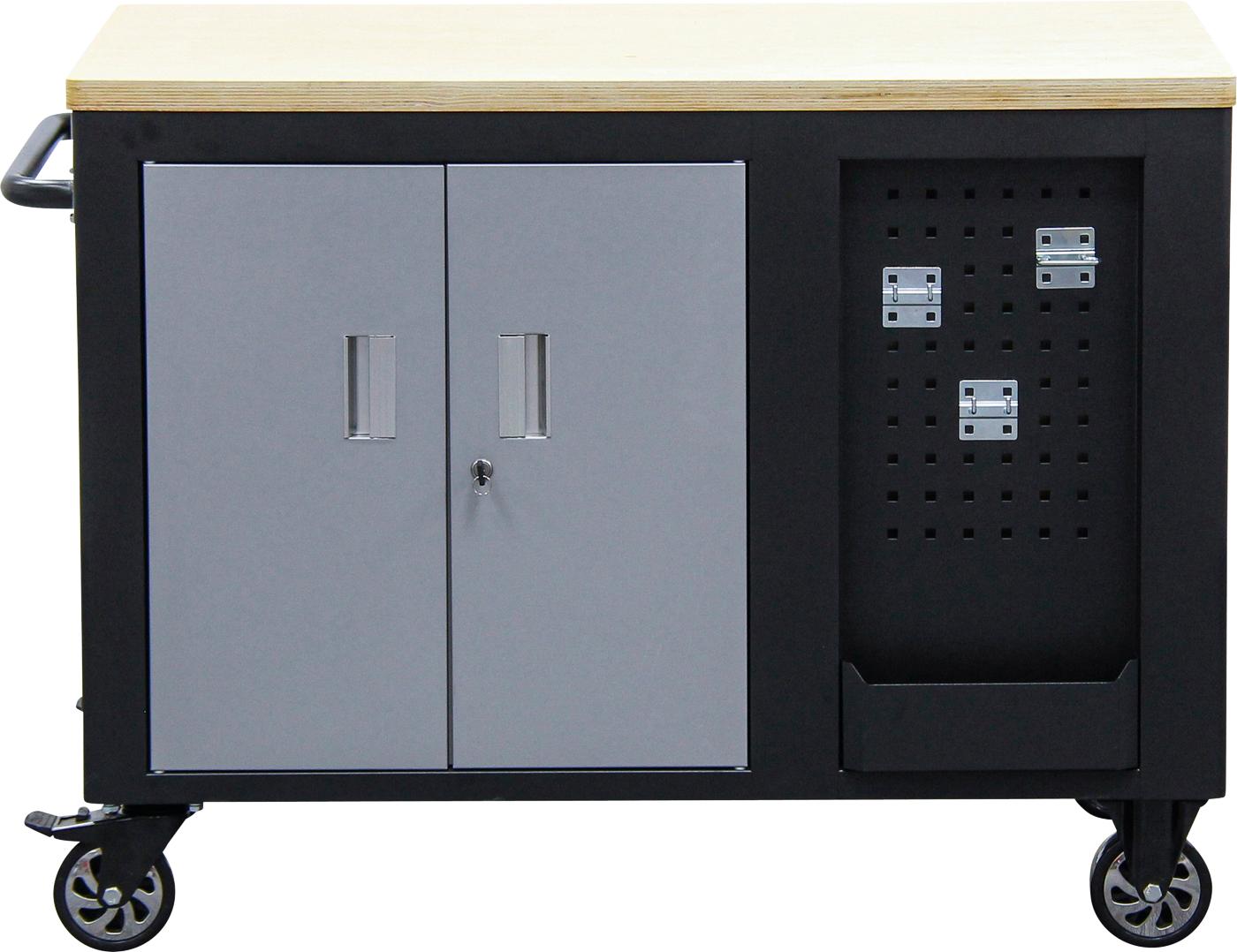 Skyrių vidiniai matmenys - 613x597x190mm. Taip pat yra 2 skyriai perforuotomis sienelėmis, prie kurių galima primontuoti norimus įrankių laikiklius ar kitus elementus. Tvirtas medinis stalviršis. Spintelėje yra 10 pilnai ištraukiami stalčių, sumontuotų ant rutulinių (guolinių) bėgelių. Stalčių išmatavimai: 569x407x69.5mm (6vnt.), 569x407x98.5mm (2vnt.) ir 569x407x213.5mm (2vnt.). Stalčių maksimali apkrova 8x25kg ir 2x35kg, stalviršio - 200kg. Rakinama centriniu užraktu. Spintelė montuojama ant 4 guminių pasukamų 127mm ratų, iš kurių 2 - su stabdžiais, turi patogią šoninę rankeną.