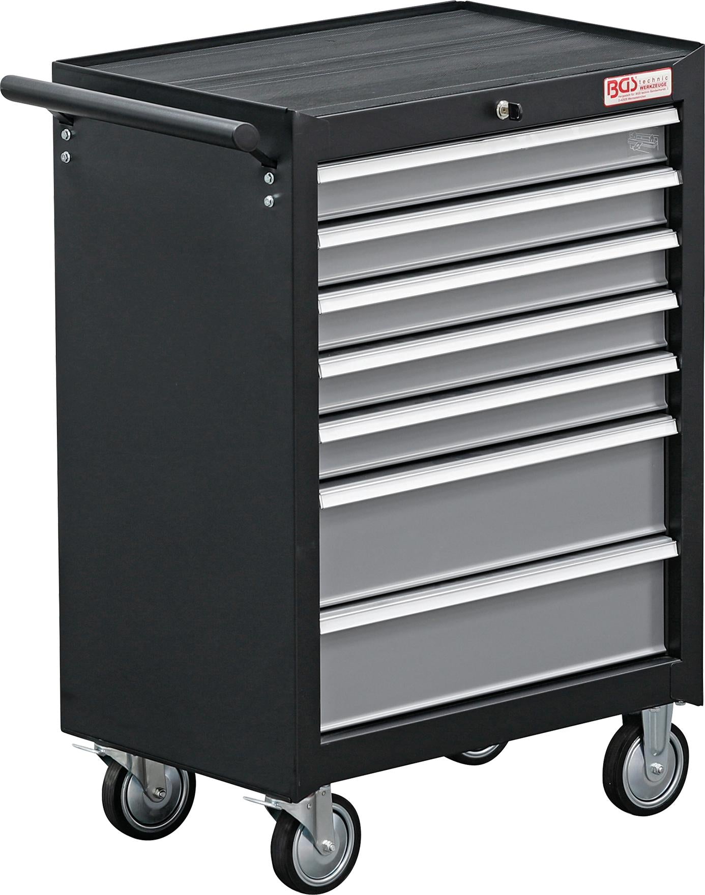 PRO+ klasės BGS Technic 2001 įrankių spintelės išoriniai matmenys 680x458x1000mm. Korpuso sienų storis - 0.9mm, stalčių sienų - 0.7mm. Patogus neslystantis stalviršis. Spintelėje yra 7 pilnai ištraukiami stalčiai, kurių išmatavimai: 569x409x52mm (5vnt.), ir 569x409x130mm (2vnt.). 1-5 stalčių maksimali apkrova 20kg, 6-7 stalčių - 25kg, stalviršio - 50kg. Rakinama centriniu užraktu. Spintelė montuojama ant 4 ratukų, iš kurių 2 - su stabdžiais. Turi patogią šoninę rankeną.