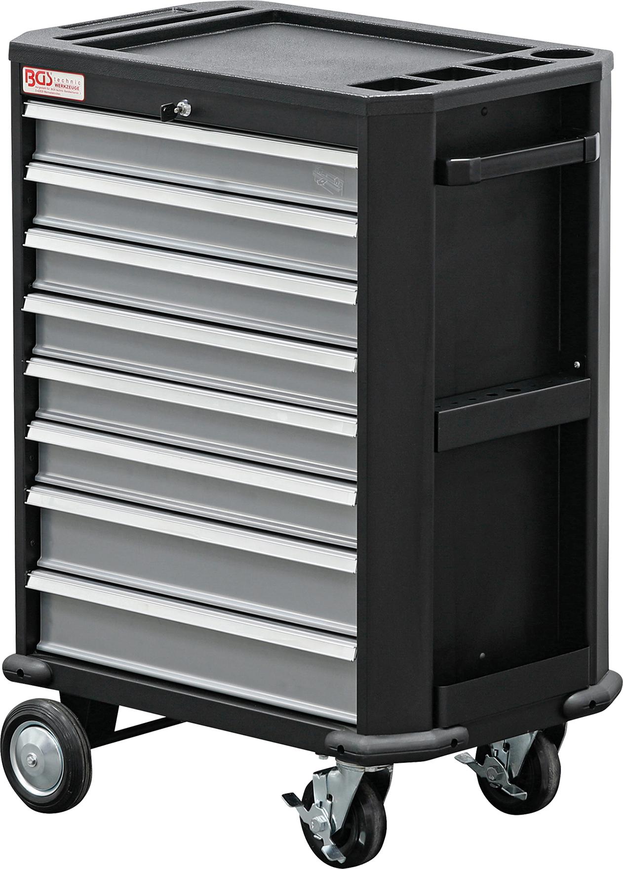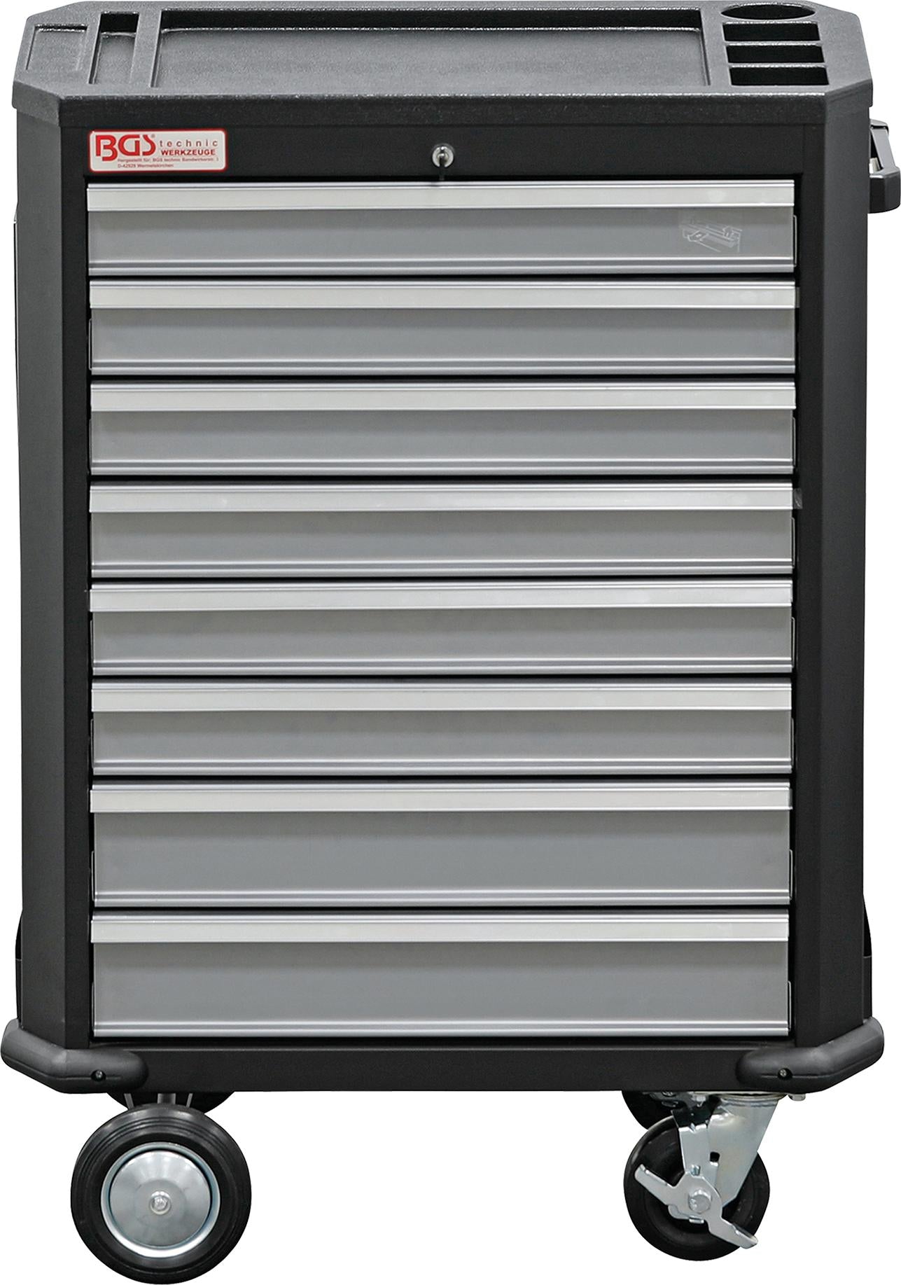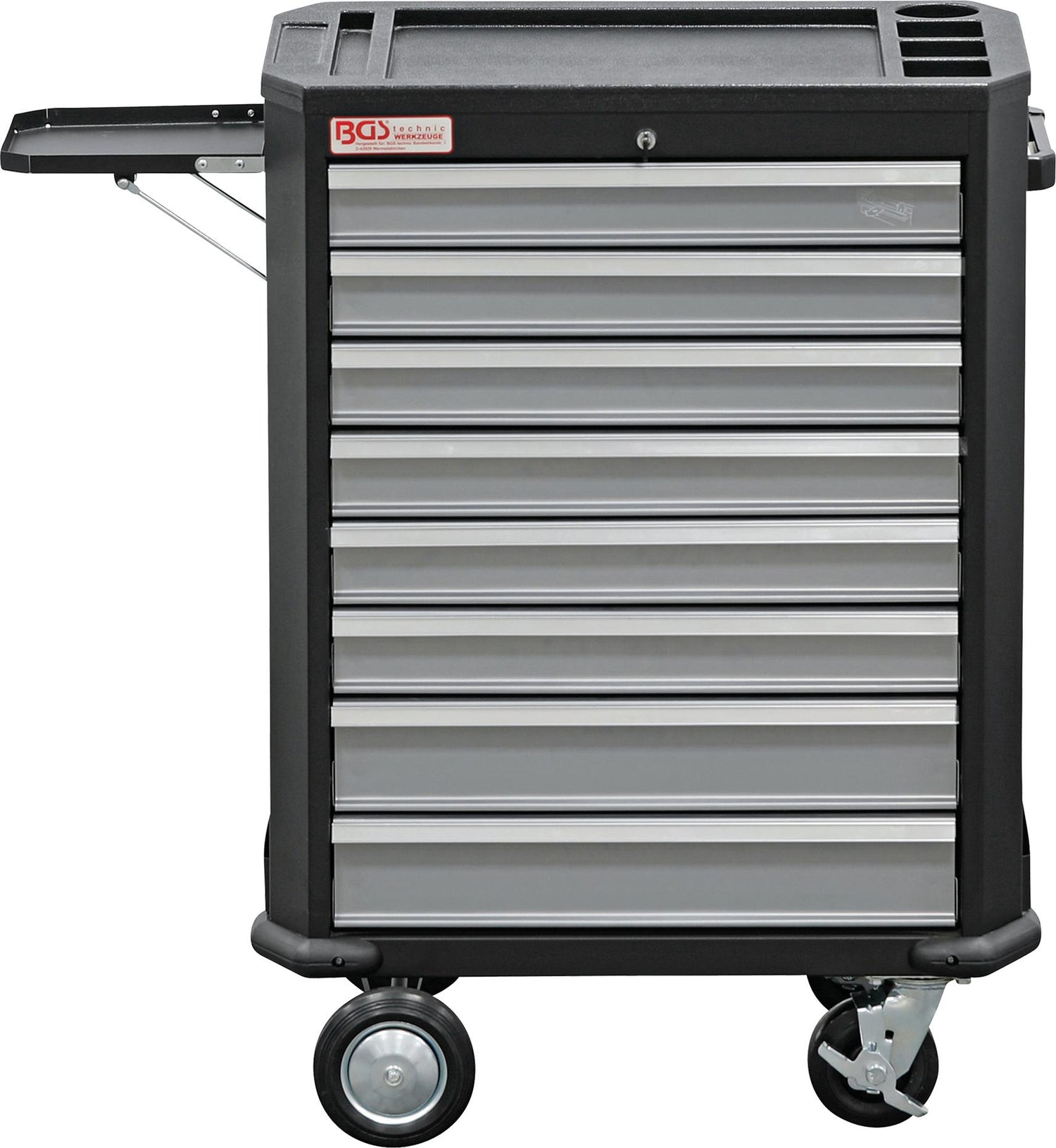 PRO+ klasės BGS Technic 4100 įrankių spintelės išoriniai matmenys 724x470x1030mm. Korpuso sienų storis - 1.0mm, stalčių sienų - 0.8mm. Praktiškas stalviršis su 6 skyriais. Spintelėje yra 8 pilnai ištraukiami stalčiai, sumontuoti ant rutulinių bėgelių, kurių išmatavimai: 569x409x80mm (6vnt.) ir 569x409x110mm (2vnt.). 1-6 stalčių maksimali apkrova 20kg, 7-8 stalčių - 25kg, stalviršio - 50kg. Rakinama centriniu užraktu. Spintelė montuojama ant 4 ratukų, iš kurių 2 - pasukami 360 laipsnių kampu, o kiti 2 - su stabdžiais. Turi atlenkiamą šoninę lentyną ir patogią rankeną.