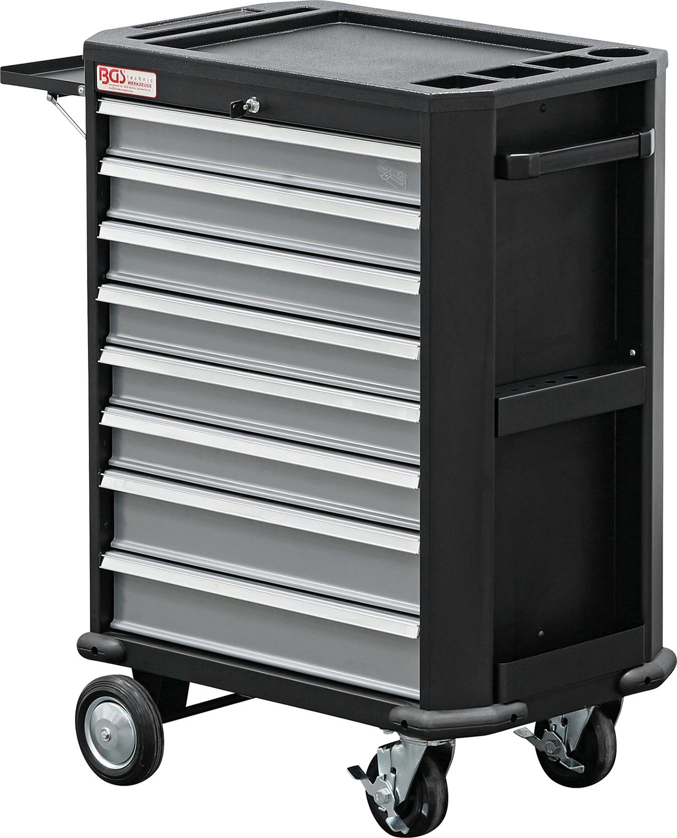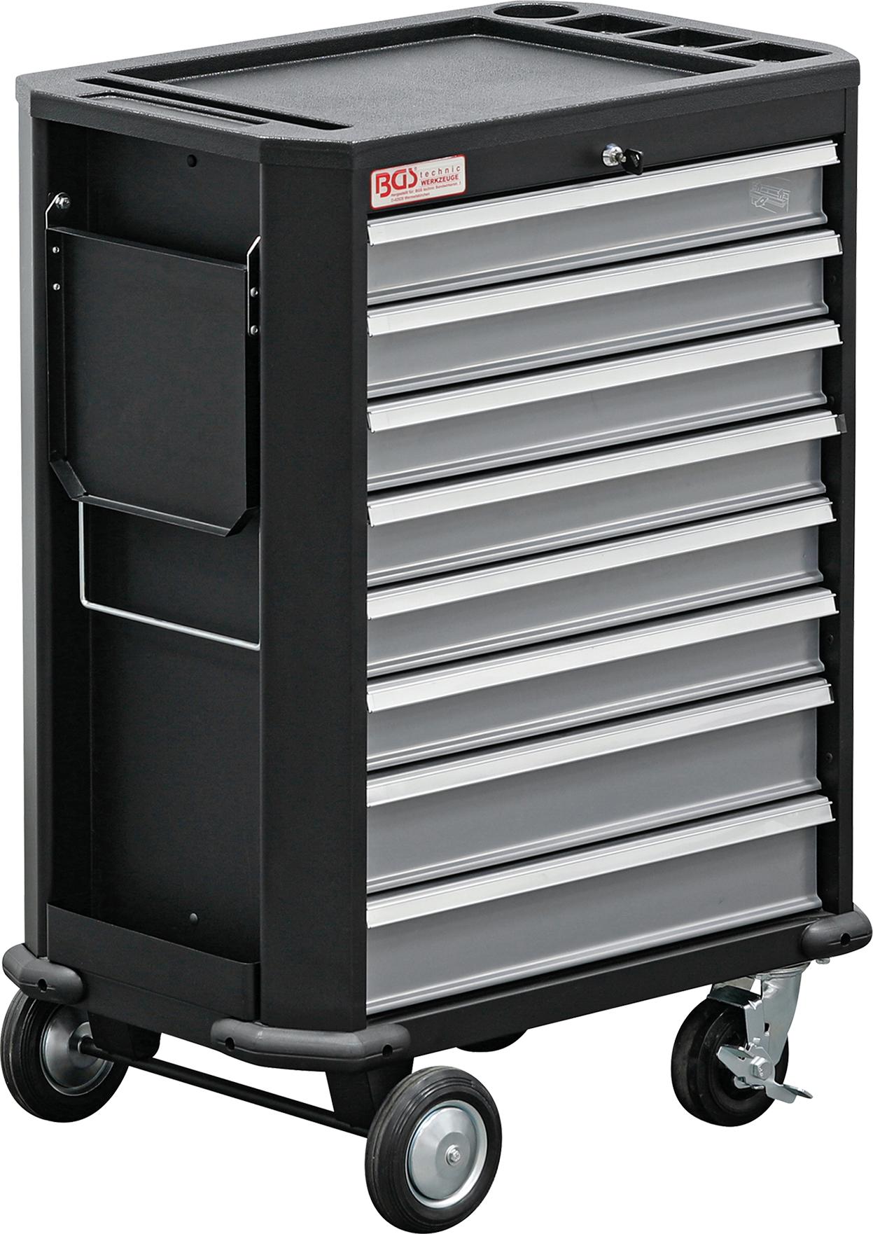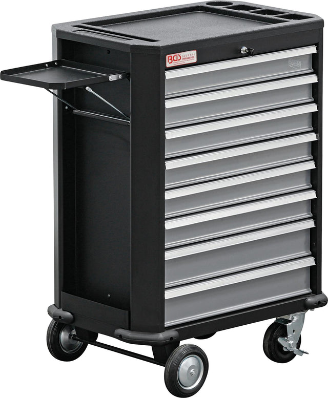 PRO+ klasės BGS Technic 4100 įrankių spintelės išoriniai matmenys 724x470x1030mm. Korpuso sienų storis - 1.0mm, stalčių sienų - 0.8mm. Praktiškas stalviršis su 6 skyriais. Spintelėje yra 8 pilnai ištraukiami stalčiai, sumontuoti ant rutulinių bėgelių, kurių išmatavimai: 569x409x80mm (6vnt.) ir 569x409x110mm (2vnt.). 1-6 stalčių maksimali apkrova 20kg, 7-8 stalčių - 25kg, stalviršio - 50kg. Rakinama centriniu užraktu. Spintelė montuojama ant 4 ratukų, iš kurių 2 - pasukami 360 laipsnių kampu, o kiti 2 - su stabdžiais. Turi atlenkiamą šoninę lentyną ir patogią rankeną.