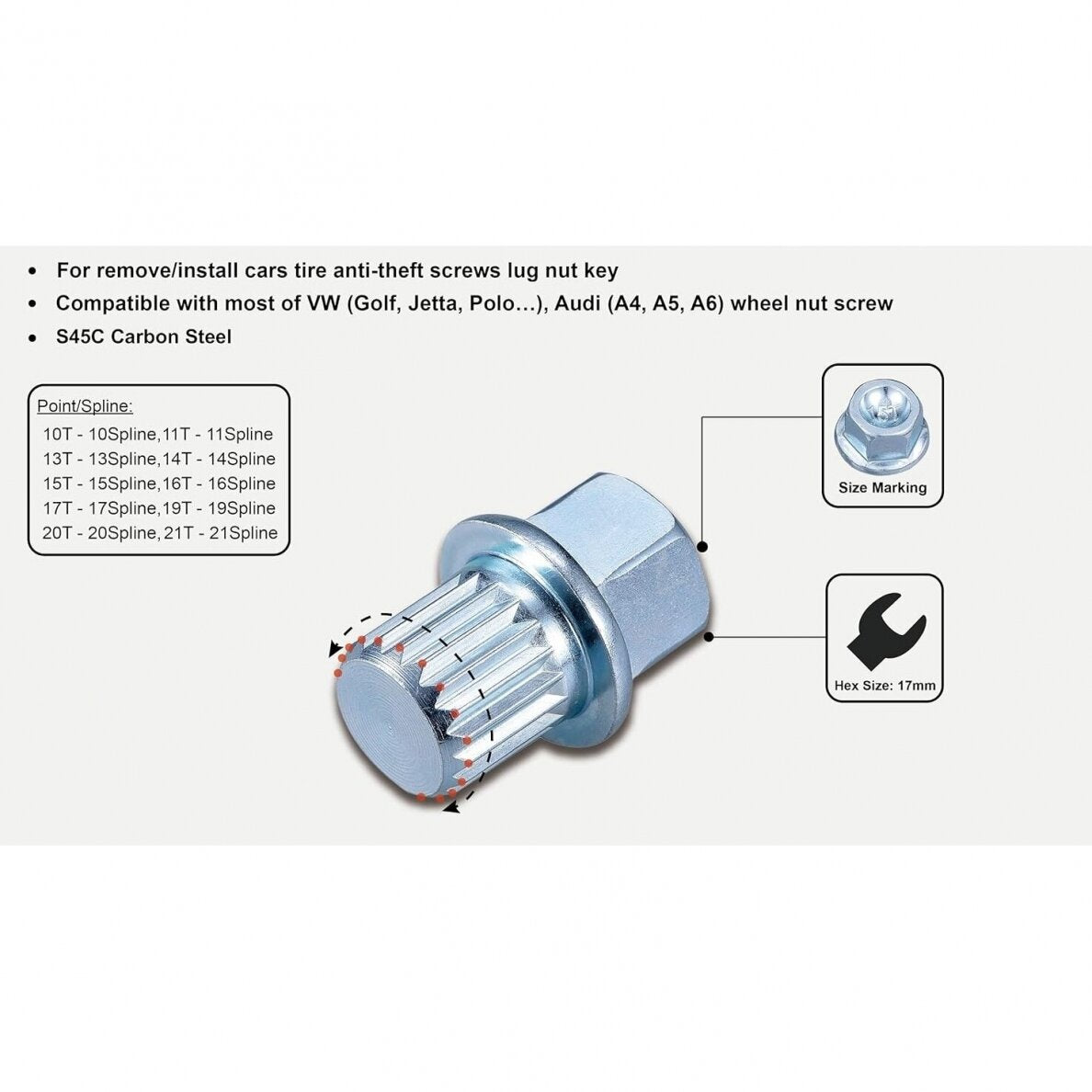 Profesionalus galvučių rinkinys H4020 skirtas specialioms VAG [Volkswagen & Audi Group] automobilių ratų veržlėms, apsaugančioms nuo vagysčių [slapukams], nuimti ir sumontuoti. Galvutės pagamintos iš aukštos kokybės S45C plieno [vidutinės klasės anglinis plienas pagal Japonijos standartą JIS G4051], kuris pasižymi geru stiprumo, kietumo ir atsparumo dilimui balansu, todėl tinka įvairioms mechaninėms ir inžinerinėms reikmėms.
