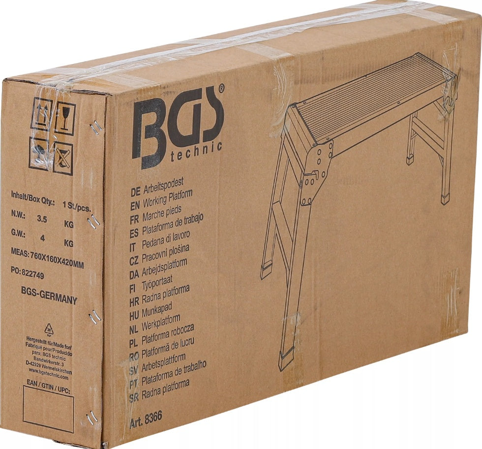 Sulankstoma platforma BGS Technic 8366 pagaminta iš itin lengvo, bet tvirto aliuminio rėmo, dėl kurio ji gali išlaikyti dideles apkrovas. Dėl stabilumo, nedidelio svorio ir kompaktiško dydžio, platforma puikiai tinka ūkio darbams, stovyklavimui, keliavimui ar žvejybai. Sulankstomą platformą lengvai sumontuosite per kelias sekundes. Baldo kojelės turi plastikinius antgalius, apsaugančius grindis nuo subraižymo.