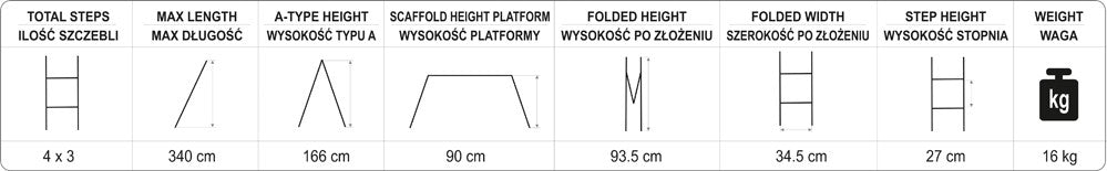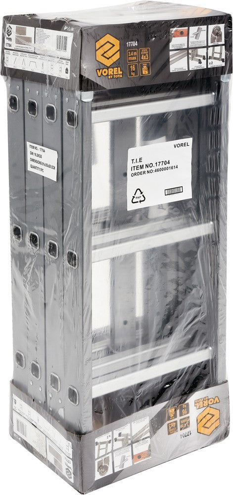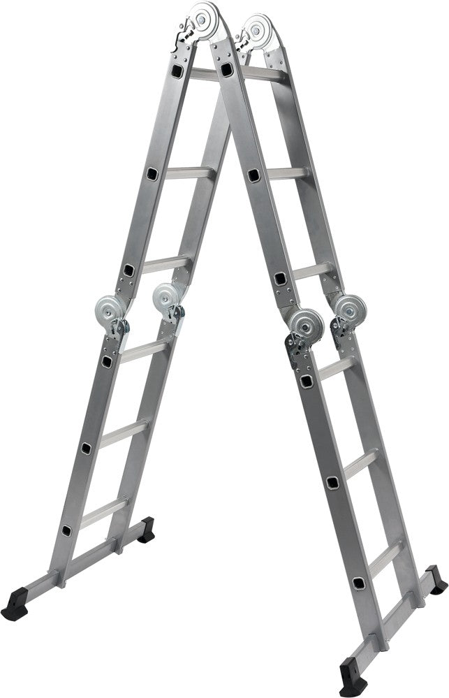 4x3 multifunction ladder with a maximum height of 3.4 m. Meets the requirements of European standard PN EN131 with a load capacity of 150 kg. It consists of four segments joined by strong and durable joints. All joints have bolt locks, allowing for quick and convenient change of ladder settings according to your needs. Thanks to this it is possible to place it in many positions, including: