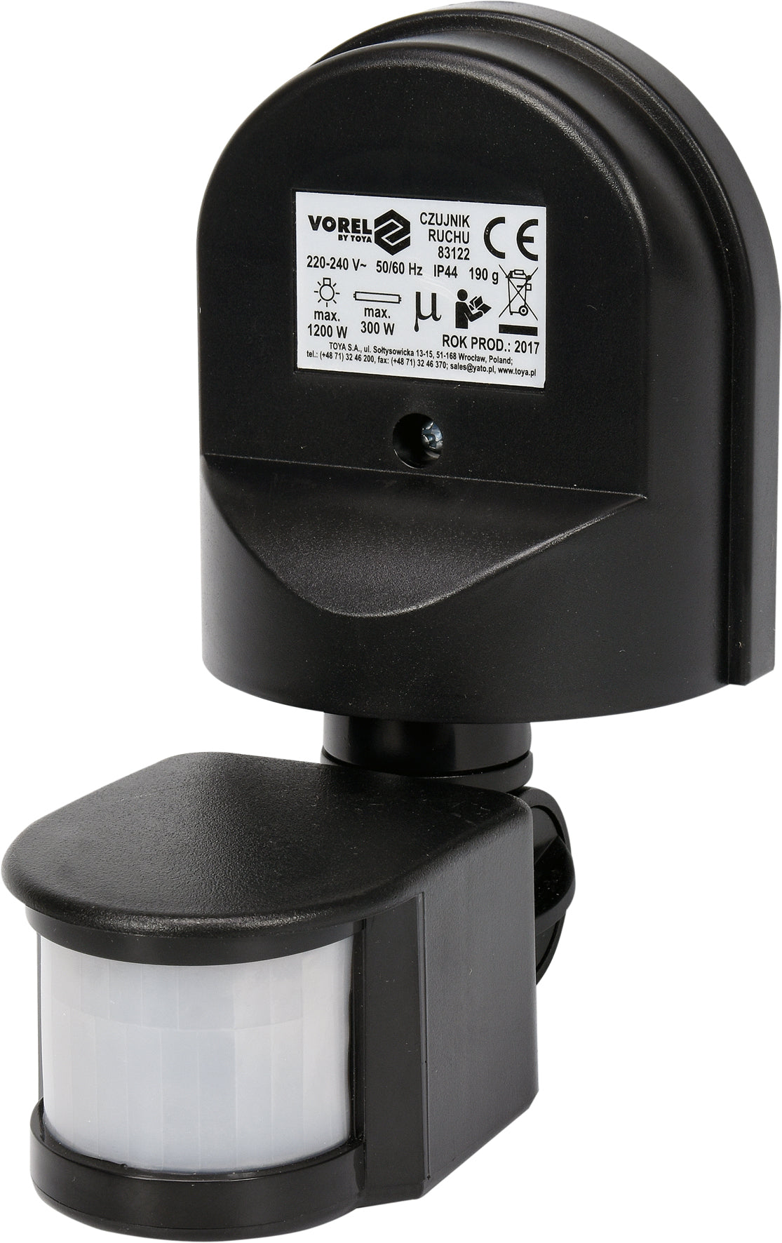 Motion sensor 83122 is equipped with an adjustable head, which after installation allows you to direct it to the desired direction. The sensor can detect movement in the range of 180 degrees at a distance of max. 12m. The maximum load of the sensor is 1200W for incandescent lighting (traditional bulb or halogen bulb) and 300W for compact fluorescent lamps. The IP44 tightness class allows the sensor to be used outdoors. It is available in black (index: 83122) and white (index: 83123).