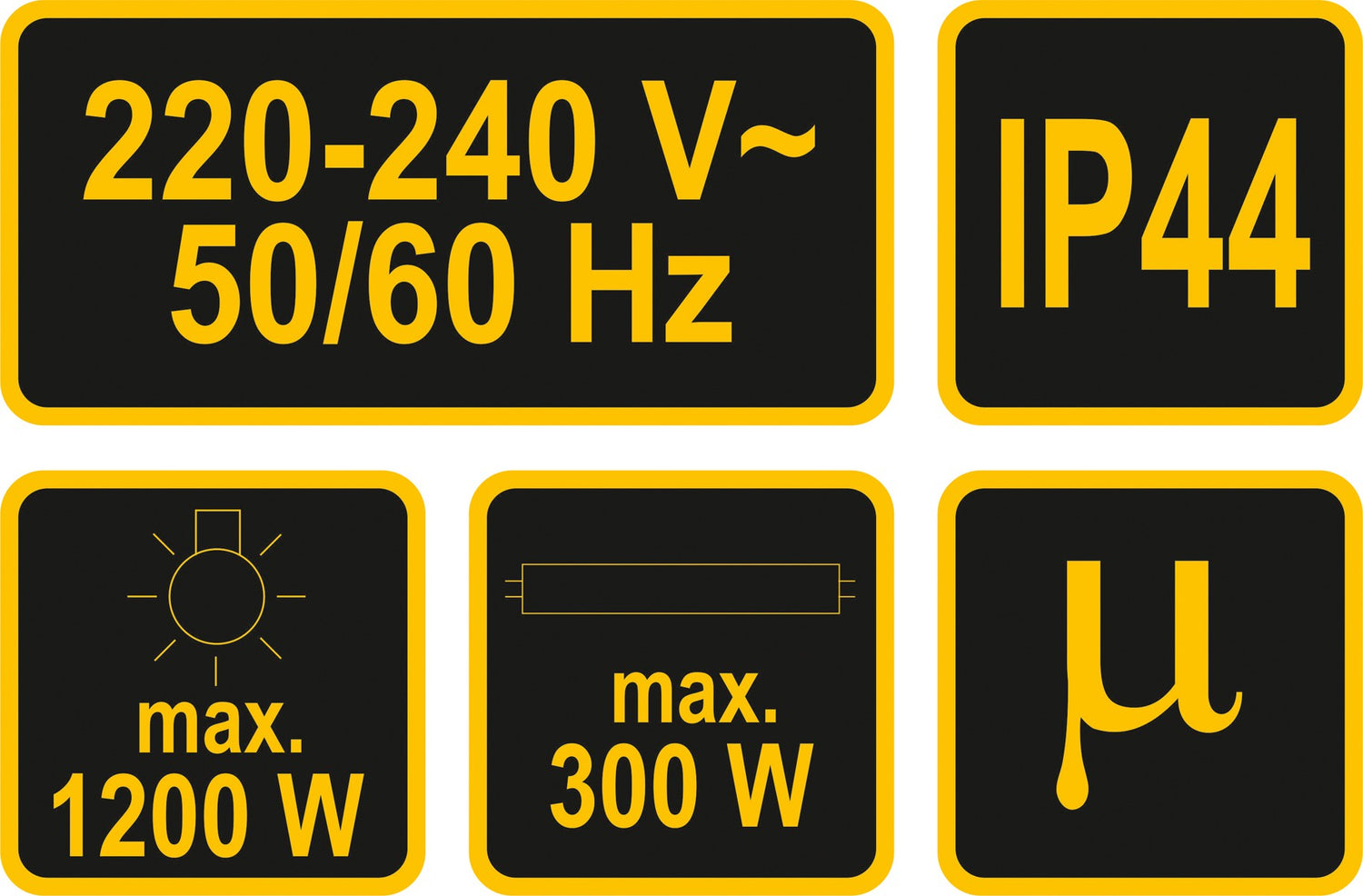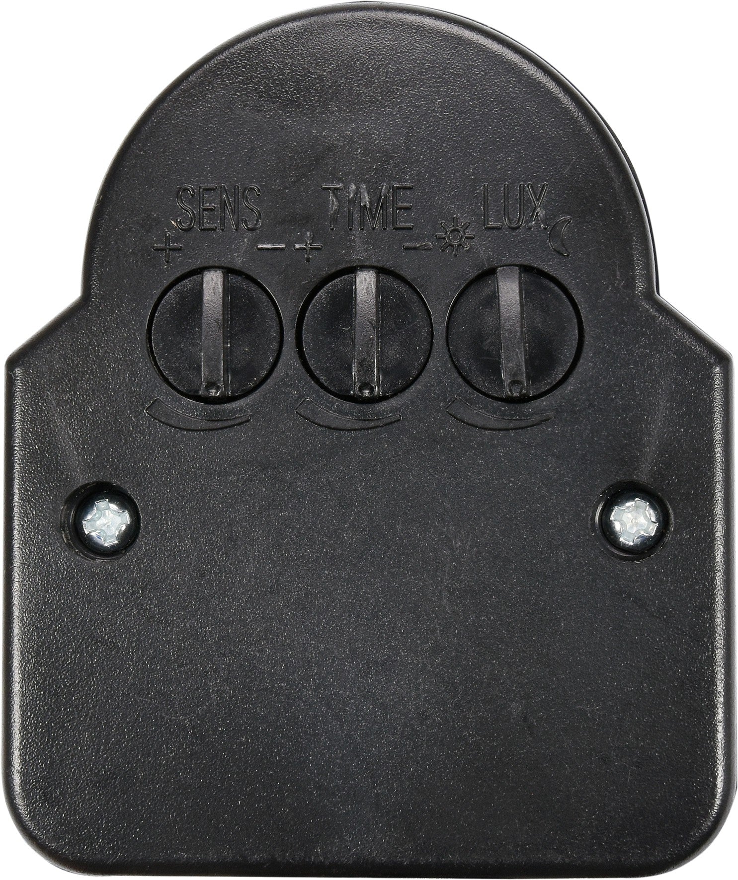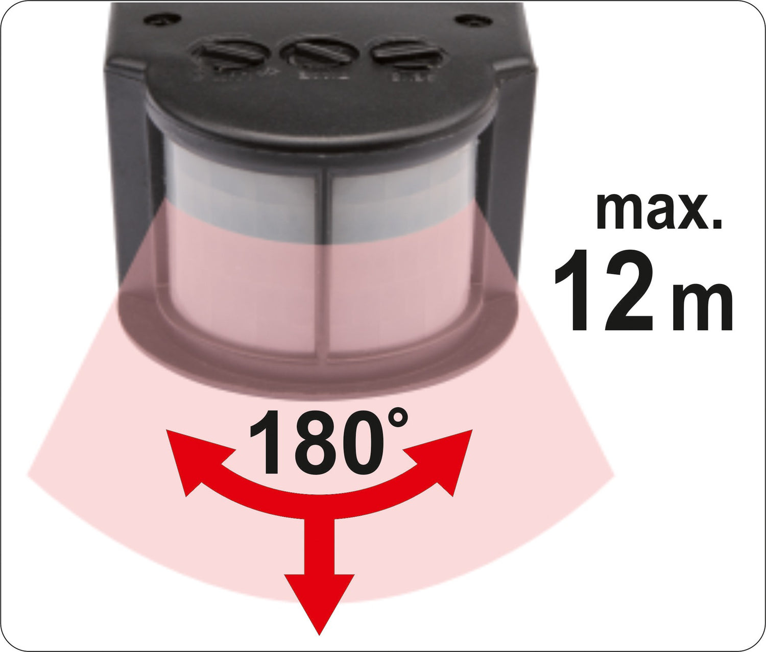 PIR, IP44, BLACK; DETECTION ANGLE: 180 DEGREES; DETECTION RANGE: 2- 12M (<24 CELS. DEGREES, ADJUSTABLE); TIME SETTING: 10 SEC-7 MIN (ADJUSTABLE); POWER SOURCE: 220~240V/ AC, 50/ 60HZ; RATED LOAD: MAX.1200W; AMBIENT LIGHT: <10LUX~2000 LUX (ADJUSTABLE)