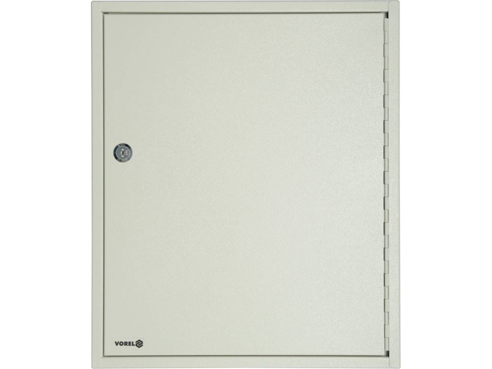Box for 80 keys, dimensions 450x380x80mm. Made of 0.7 mm thick sheet steel, varnished in ivory color. Inside, 8 rows with hooks for hanging keys with the possibility of adjusting the height of the suspension. Number stickers for hook marking included. Lockable cabinet door with 2 keys. Rear panel with mounting holesydis [mm] 450x380x80