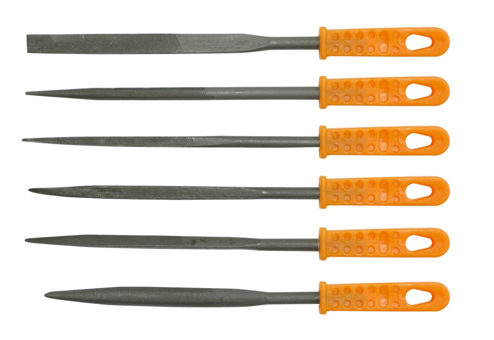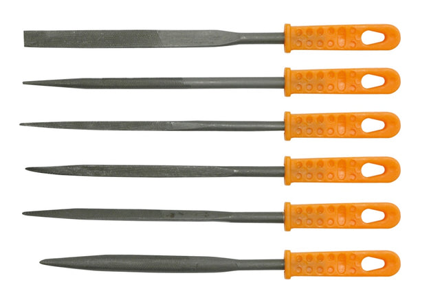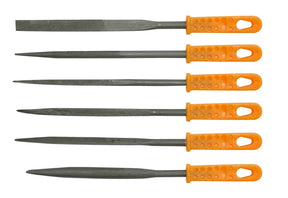 The set contains six files for precision work such as making keys. Basic profiles are flat, semicircular, round, triangular, sword and knife. Files with hard plastic handles.