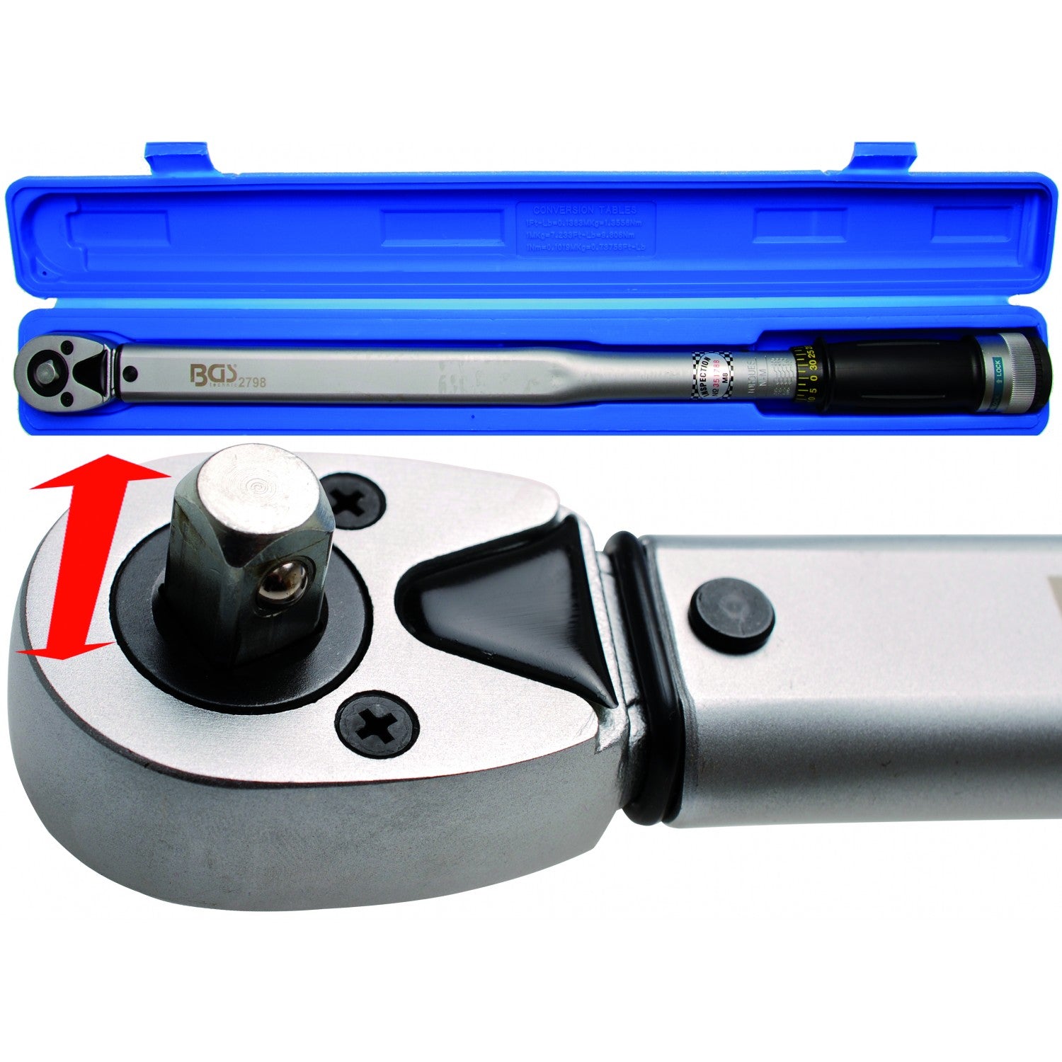 Dvipusio veikimo dinamometrinis reversinis terkšlinis raktas BGS Technic 2798 - tai PRO+ klasės įrankis, skirtas tiksliam sukimo momentui taikyti sukant varžtus ir veržles. Įrankis tinkamas sukti varžtus ir veržles su kairiniais ir dešininiais sriegiais, pagamintas iš tvirto chromo molibdeno [CrMo] įrankių plieno. Sukimo momentas fiksuojamas slankios įvorės pagalba. Dinamometrinis raktas pateikiamas tvirtame plastikiniame BGS Technic lagamine.