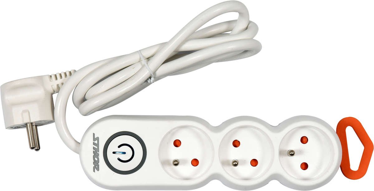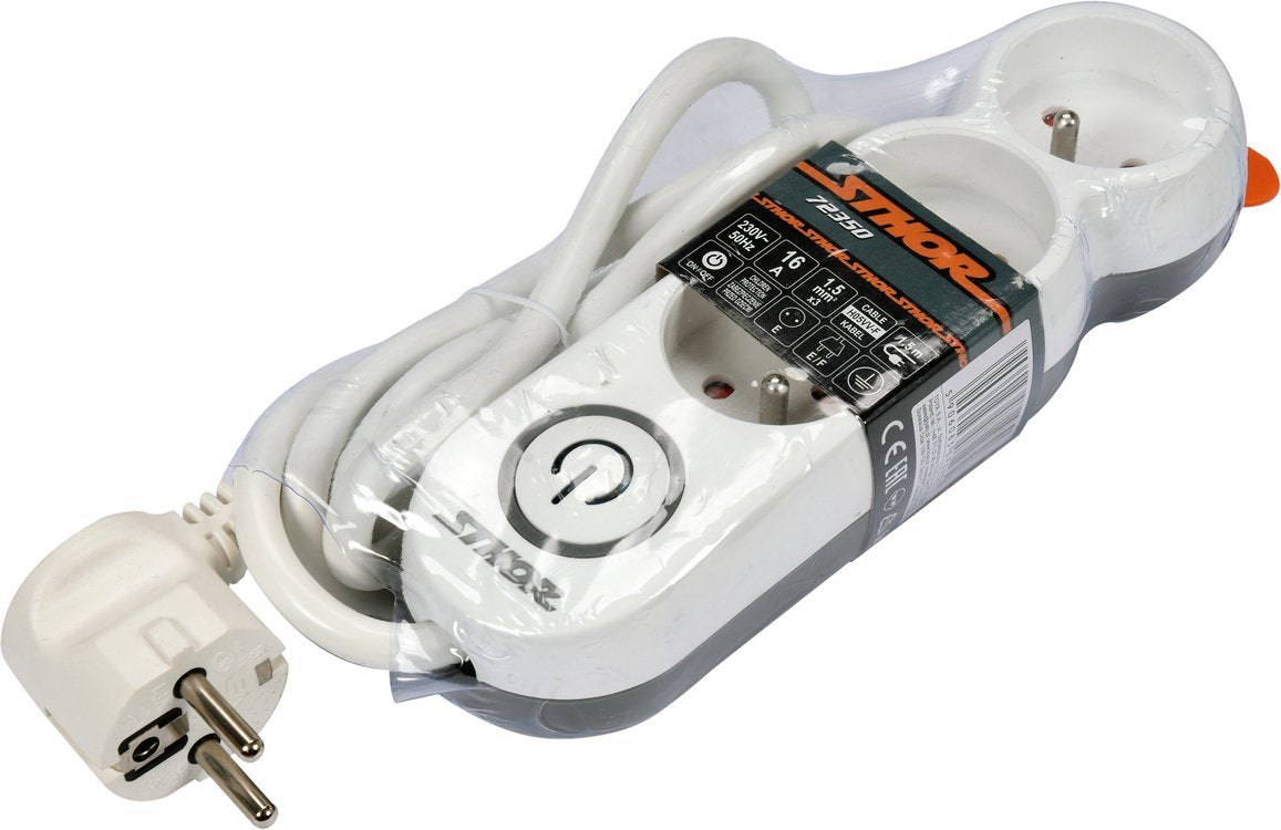 EKO+ klasės įžemintas buitinis prailgintuvas STHOR 72350 - trijų gyslų 1.5mm2 kabelis su trimis lizdais ir bendru jungikliu visam blokeliui, skirtas naudoti namuose, biure ar garaže. Šio prailgintuvo pagalba galima lengvai maitinti buitinius prietaisus, kaip virduliai, lygintuvai, dulkių siurbliai, virtuviniai kombainai ir panašiai. Prailgintuvą galima lengvai pritvirtinti prie stalviršio ar sienos. PVC kabelio izoliacija atspari mechaniniams pažeidimams, daugumai tirpiklių, žemai temperatūrai. Korpusas pagamintas iš aukštos kokybės ABS plastiko. Apsauga nuo vaikų.