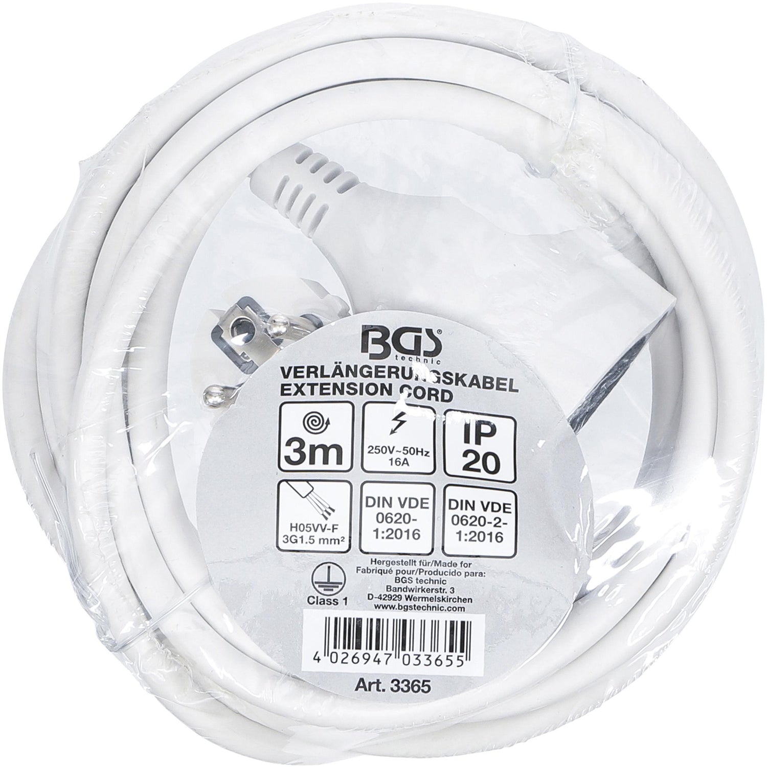 DIY+ klasės įžemintas prailgintuvas BGS Technic 3365 - trijų gyslų varinis 1.5mm2 kabelis su dulkėms atspariu IP20 lizdu. Skirtas naudojimui viduje. Lizdui tinka CEE7/7 tipo kištukai. PVC kabelio izoliacija atspari mechaniniams pažeidimams, daugumai tirpiklių, žemai temperatūrai.