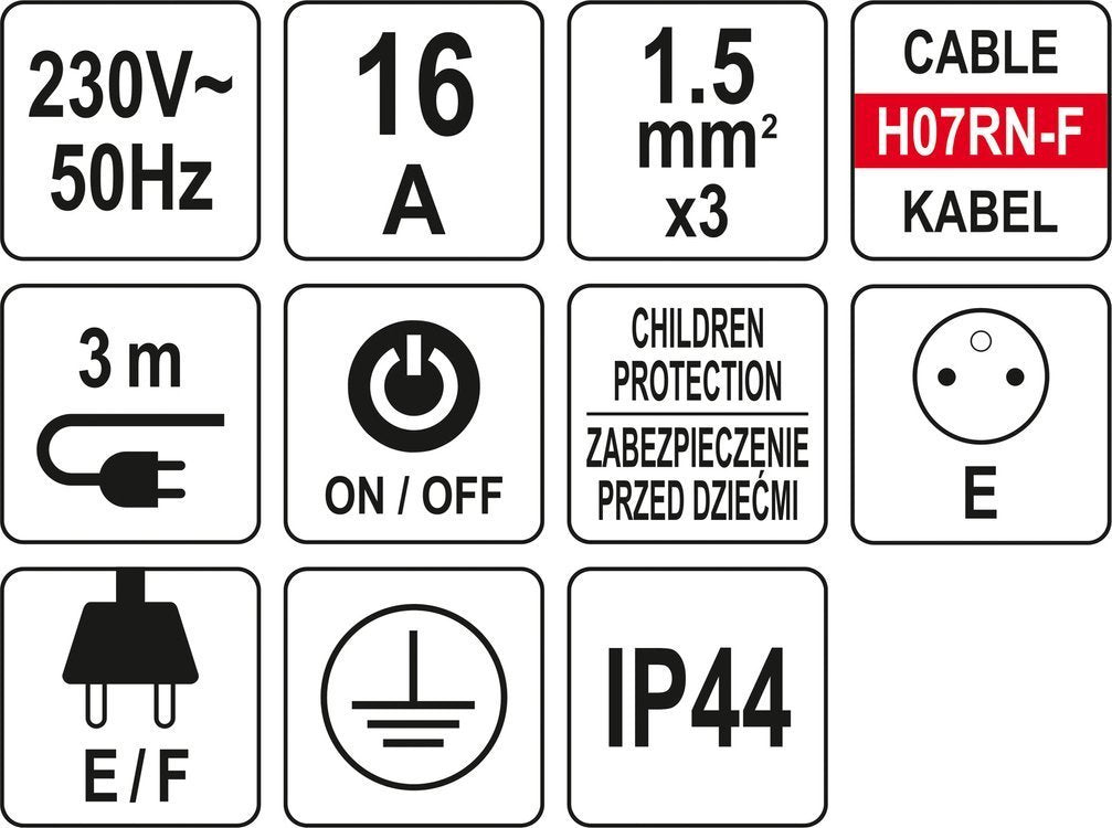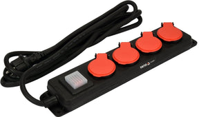 PRO klasės įžemintas prailgintuvas YATO YT-81241 - trijų gyslų 1.5mm2 varinių laidų kabelis su keturiais lizdais ir bendru jungikliu visam blokeliui, skirtas naudoti statybose, autoservise ar garaže. Tinka E ir F tipų kištukai. Prailgintuvą galima lengvai pritvirtinti prie stalviršio ar sienos. Iš neopreno pagaminta kabelio izoliacija itin atspari mechaniniams pažeidimams, oro sąlygoms (saulei, šalčiui), chemikalams (aušinimo ir tepimo alyvoms, benzinui ar etilo ir metilo alkoholiams) ir ugniai, užtikrina kabelio lankstumą ir tinkamą apsaugą taip pat ir dirbant lauke. Vidinių kabelio laidų izoliacijai naudota natūralus kaučiukas. Dulkėms ir purslams atsparūs IP44 lizdai su dangteliais garantuoja apsaugą nuo drėgmės, dulkių ir smėlio. Korpusas pagamintas iš tvirto plastiko.