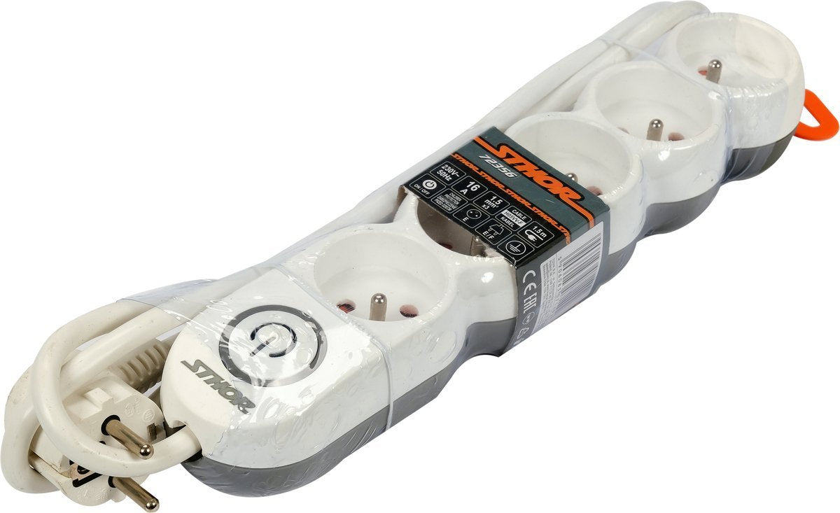 EKO+ klasės įžemintas buitinis prailgintuvas STHOR 72356 - trijų gyslų 1.5mm2 kabelis su penkiais lizdais ir bendru mėyno apšvietimo jungikliu visam blokeliui, skirtas naudoti namuose, biure ar garaže. Šio prailgintuvo pagalba galima lengvai maitinti buitinius prietaisus, kaip virduliai, lygintuvai, dulkių siurbliai, virtuviniai kombainai ir panašiai. Prailgintuvą galima lengvai pritvirtinti prie stalviršio ar sienos. PVC kabelio izoliacija atspari mechaniniams pažeidimams, daugumai tirpiklių, žemai temperatūrai. Korpusas pagamintas iš aukštos kokybės ABS plastiko. Apsauga nuo vaikų.