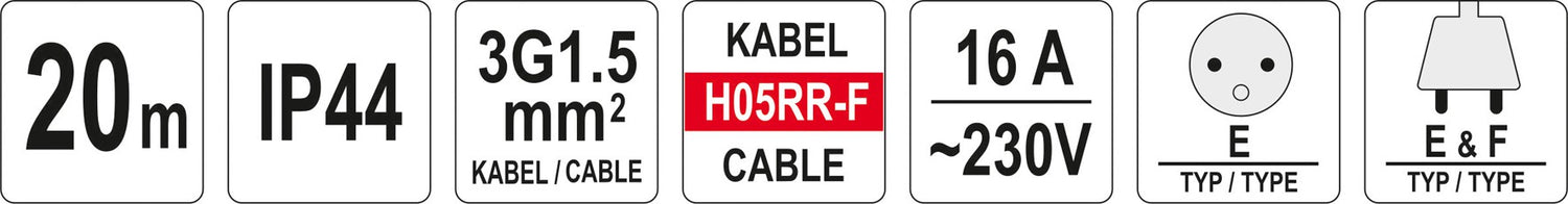 PRO klasės įžemintas prailgintuvas YATO YT-81052 - trijų gyslų varinis 1.5mm2 laidas, suvyniotas ant ritės su keturiais dulkėms ir vandens purslams atspariais lizdais, pagamintos iš lengvo ir patvaraus plastiko. Tinkami E ir F tipo kištukai. Ritė sumontuota ant tvirto metalinio rėmo su ergonomiška rankena. Iš natūralaus kaučiuko pagaminta laido izoliacija itin atspari mechaniniams pažeidimams, oro sąlygoms (saulei, šalčiui), chemikalams (aušinimo ir tepimo alyvoms, benzinui ar etilo ir metilo alkoholiams), užtikrina kabelio lankstumą ir tinkamą apsaugą taip pat ir dirbant lauke. Dulkėms ir purslams atsparūs IP44 lizdai su dangteliais garantuoja apsaugą nuo drėgmės, dulkių ir smėlio. Šiluminė apsauga nutraukia maitinimą, kai kabelio temperatūra pasiekia 56°C (+/- 5°C). Apsauga nuo vaikų.