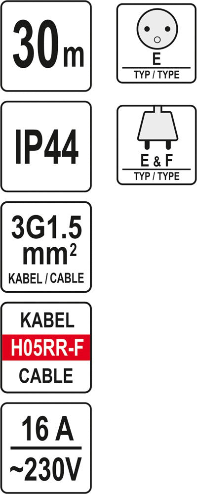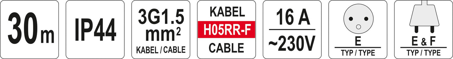 PRO klasės įžemintas prailgintuvas YATO YT-81053 - trijų gyslų varinis 1.5mm2 laidas, suvyniotas ant ritės su keturiais dulkėms ir vandens purslams atspariais lizdais, pagamintos iš lengvo ir patvaraus plastiko. Tinkami E ir F tipo kištukai. Ritė sumontuota ant tvirto metalinio rėmo su ergonomiška rankena. Iš natūralaus kaučiuko pagaminta laido izoliacija itin atspari mechaniniams pažeidimams, oro sąlygoms (saulei, šalčiui), chemikalams (aušinimo ir tepimo alyvoms, benzinui ar etilo ir metilo alkoholiams), užtikrina kabelio lankstumą ir tinkamą apsaugą taip pat ir dirbant lauke. Dulkėms ir purslams atsparūs IP44 lizdai su dangteliais garantuoja apsaugą nuo drėgmės, dulkių ir smėlio. Šiluminė apsauga nutraukia maitinimą, kai kabelio temperatūra pasiekia 56°C (+/- 5°C). Apsauga nuo vaikų.