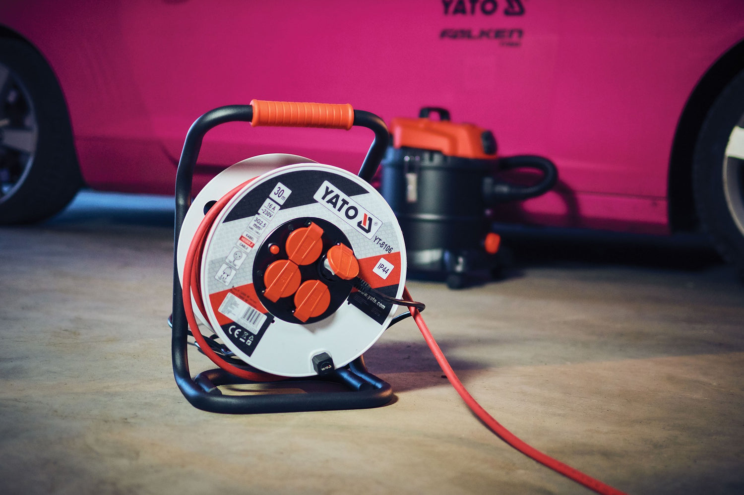 PRO+ klasės įžemintas prailgintuvas YATO YT-8106 - trijų gyslų varinis 2.5mm2 kabelis, suvyniotas ant ritės su keturiais dulkėms ir vandens purslams atspariais lizdais, pagamintos iš patvaraus plastiko. Prailgintuvas skirtas naudoti statybose, autoservisuose ir dirbtuvėse su prietaisais, kuriems reikalinga aukšta įtampa, kaip inverteriniai suvirinimo aparatai, kompresoriai ar medžio staklės. Tinkami E ir F tipo kištukai. Ritė sumontuota ant tvirto metalinio rėmo su ergonomiška rankena. Iš natūralaus kaučiuko pagaminta kabelio izoliacija itin atspari mechaniniams pažeidimams, oro sąlygoms (saulei, šalčiui), chemikalams (aušinimo ir tepimo alyvoms, benzinui ar etilo ir metilo alkoholiams), užtikrina kabelio lankstumą ir tinkamą apsaugą taip pat ir dirbant lauke. Dulkėms ir purslams atsparūs IP44 lizdai su dangteliais garantuoja apsaugą nuo drėgmės, dulkių ir smėlio. Šiluminė apsauga nutraukia maitinimą, kai kabelio temperatūra pasiekia 56°C (+/- 5°C). Apsauga nuo vaikų.