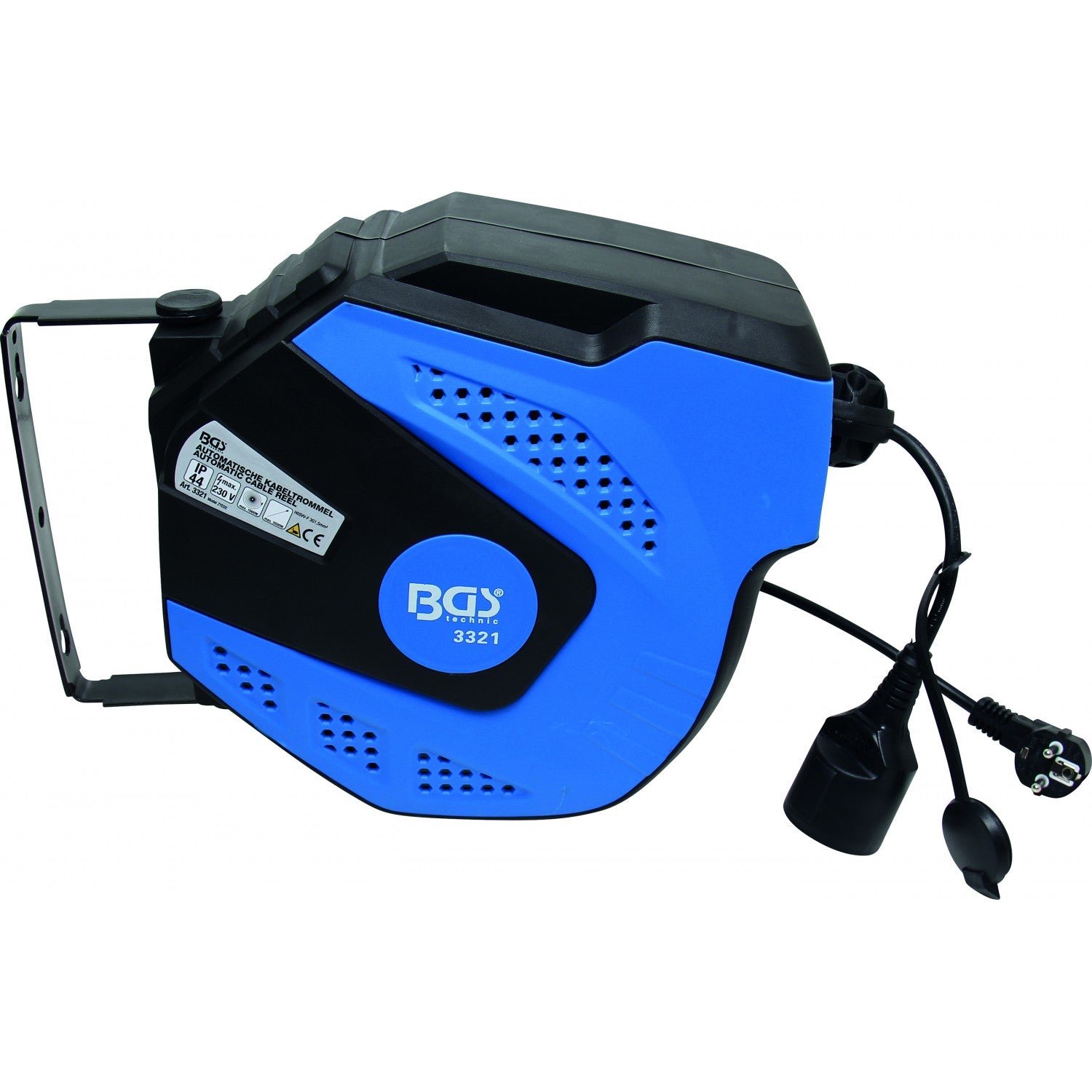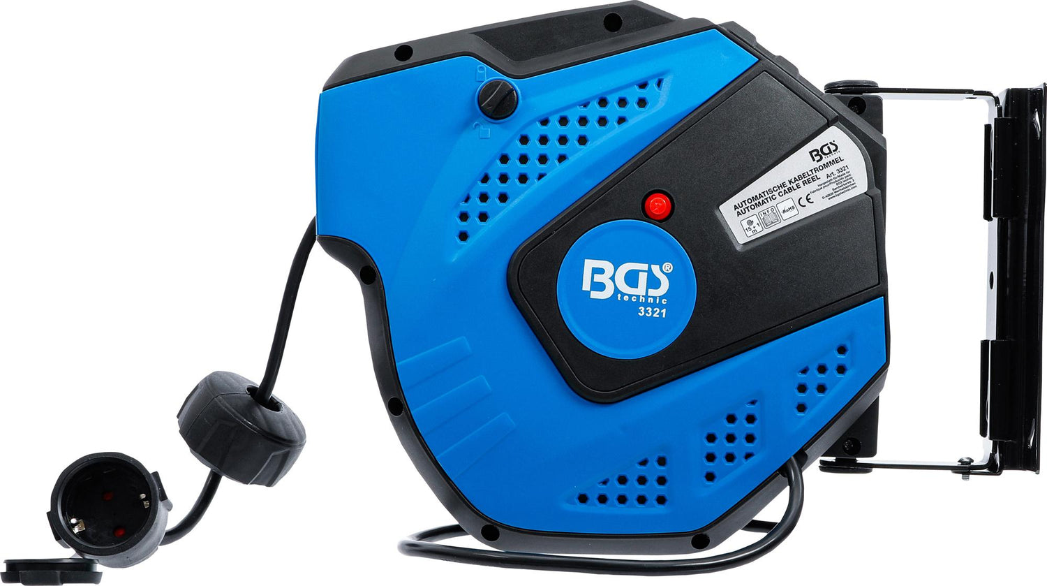 PRO+ klasės įžemintas prailgintuvas BGS Technic 3321 - trijų gyslų varinis 1.5mm2 kabelis, suvyniotas ant automatinės ritės su dulkėms ir vandens purslams atspariu lizdu, pagamintos iš patvaraus plastiko. Automatinę ritę lengva pritvirtinti prie darbastalio ar sienos pridedamo laikiklio pagalba. PVC kabelio izoliacija atspari mechaniniams pažeidimams, daugumai tirpiklių, žemai temperatūrai. Šiluminė apsauga.