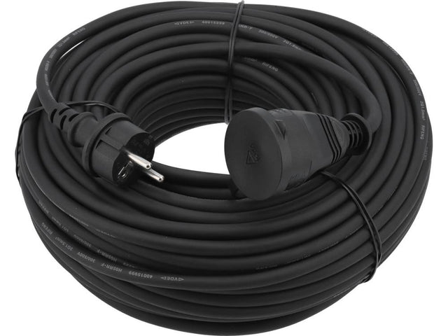 Construction extension cord with dust and splash-proof socket. The cable in a chlorinated polyethylene (CPE) sheath will work both indoors and outdoors. It is resistant to oils, acids, most solvents and sunlight. It does not stiffen in the cold. Does not spread fire. It is characterized by high aging resistance.