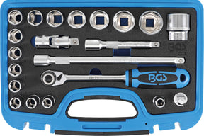 Profesionalių įrankių rinkinį BGS Technic 2225 sudaro 21 vnt. PRO+ klasės įrankių, pagamintų iš chromo vanadžio (CrV) plieno lydinio. Komplekte yra 1/2" šešiakampių HEX galvučių rinkinys, itin plonas tiesaus profilio 72 dantų reversinis terkšlinis raktas, prailgintuvas ir kiti elementai. Pro Torque® raižyto korpuso knurled galvutės pasižymi geresniu sukibimu. Įrankiai dengti chromu ir sudėlioti kompaktiškoje dėtuvėje. Šios konfigūracijos profesionalių įrankių rinkinys tinka smulkiems surinkimo darbams, automobilių remontui bei kitiems darbams namuose ar dirbtuvėse.