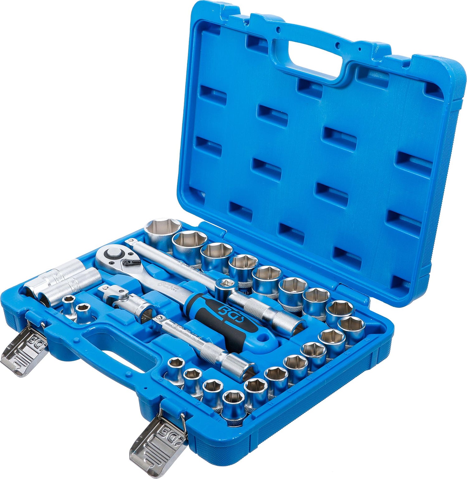 Profesionalių įrankių rinkinį BGS Technic 2224 sudaro 27 vnt. PRO+ klasės įrankių, pagamintų iš chromo vanadžio (CrV) plieno lydinio. Komplekte yra 1/2" šešiakampių HEX galvučių rinkinys, 72 dantų reversinis terkšlinis raktas, du šarnyriniai prailgintuvai ir kiti elementai. Pro Torque® raižyto korpuso knurled galvutės pasižymi geresniu sukibimu. Įrankiai atitinka DIN (Deutsches Institut für Normung - Vokietijos standartizavimo instituto) standartus. Šios konfigūracijos profesionalių įrankių rinkinys tinka smulkiems surinkimo darbams, automobilių remontui bei kitiems darbams namuose ar dirbtuvėse.