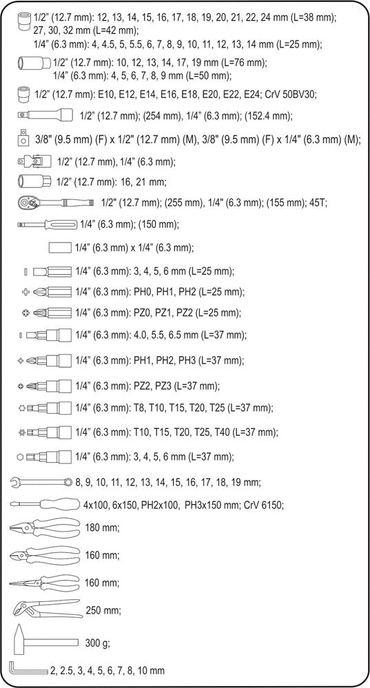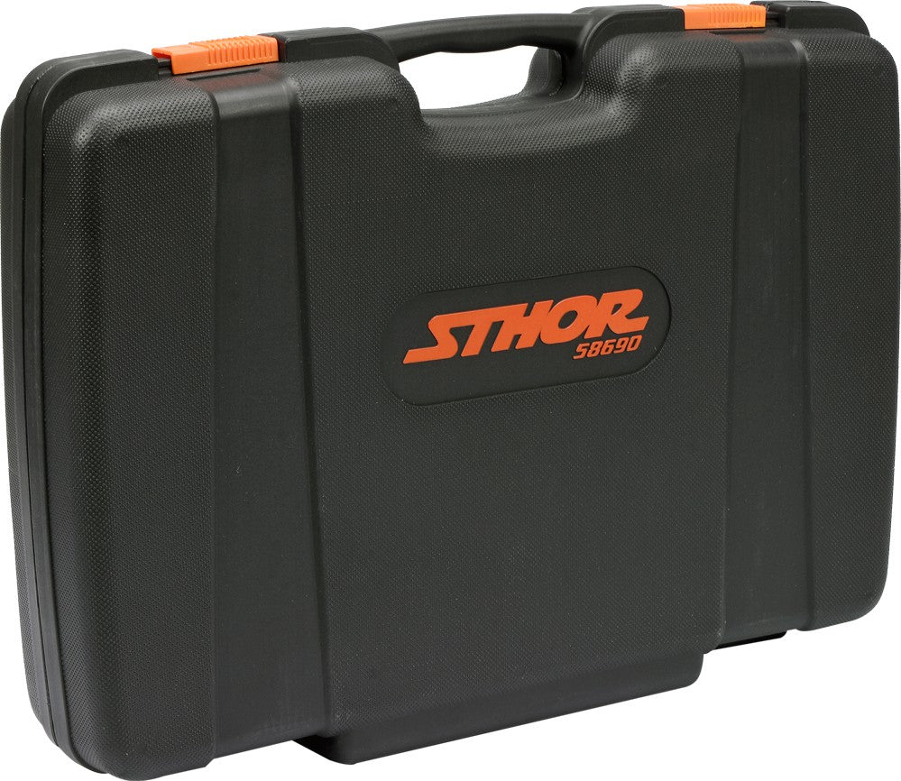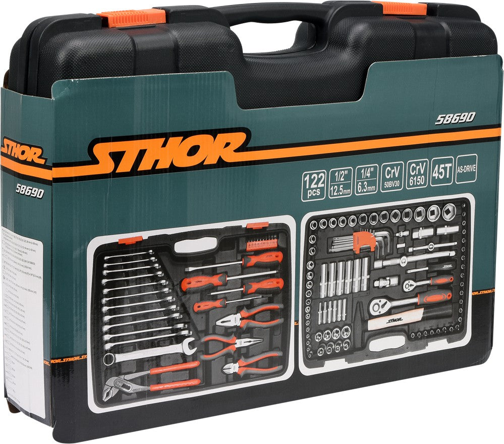 STHOR 58690 DIY klasės įrankių rinkinį sudaro 108 įrankiai, pagaminti iš chromo vanadžio plieno lydinio (CrV50BV30 | CrV6150), išdėstyti patogiame plastikiniame lagamine. Galvutės su AS-Drive sistema padidina maksimalų sukimo momentą 25%. Rinkinyje yra 1/4 "ir 1/2" šešiakampių HEX ir TORX galvučių rinkiniai, kombinuotų veržliarakčių komplektas, 45 dantų reversiniai terkšliniai raktai ir daugybė kitų įrankių, tinkančių smulkesniems surinkimo darbams, automobilių remontui bei daugeliui kitų darbų namuose ar dirbtuvėse.