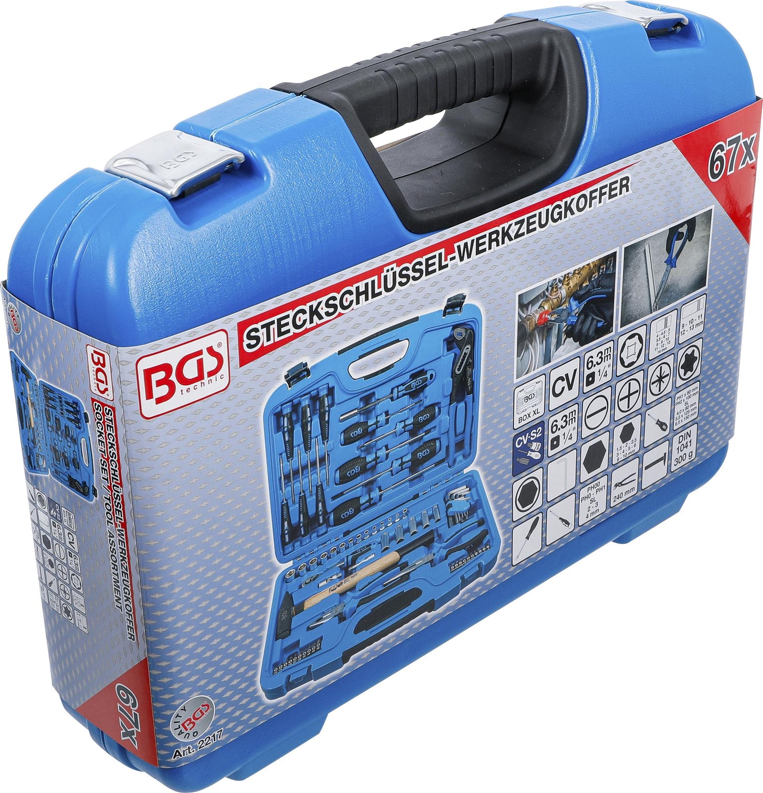 PRO+ klasės įrankių rinkinį BGS Technic 2217 sudaro 67 vnt. įrankių neslystančiomis ergonomiškomis 2 dalių rankenomis, pagamintų iš chromo vanadžio (CrV) plieno lydinio. Komplekte yra 1/4" ir 1/2" šešiakampių HEX galvučių rinkinys, antgalių komplektas, prailgintuvas, 72 dantų reversinis terkšlinis raktas, precizinių atsuktuvų rinkinys ir daugybė kitų įrankių. Pro Torque® raižyto korpuso knurled galvutės pasižymi geresniu sukibimu. Įrankiai dengti matiniu chromu (Satin Chrome) ir patogiai sudėlioti tvirtame lagamine metalinėmis sagtimis. Šios konfigūracijos profesionalių įrankių rinkinys tinka surinkimo darbams, automobilių remontui bei daugeliui kitų darbų namuose ar dirbtuvėse. Įrankiai atitinka DIN (Deutsches Institut für Normung - Vokietijos standartizavimo instituto) standartus.