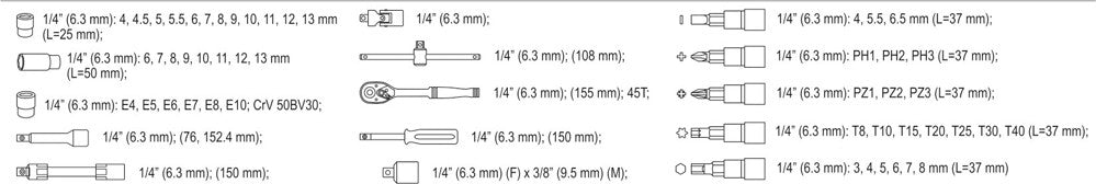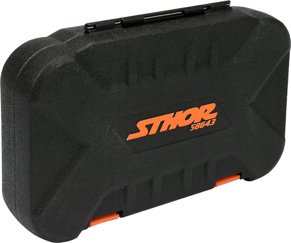 STHOR 58643 DIY klasės įrankių rinkinį sudaro 56 įrankiai ir jų dalys, išdėstyti patogiame plastikiniame lagamine. Komplekte yra 1/4" šešiakampių HEX ir TORX galvučių rinkinys, įpresuotų antgalių komplektas, prailgintuvas, 45 dantų reversinis terkšlinis raktas, universali (kardaninė) jungtis ir kiti elementai. Galvutės preciziškai sukalibruotos, pagamintos iš tvirto chromo vanadžio plieno (CrV50BV30), tinka didelio intensyvumo naudojimui. AS-Drive sistema padidina maksimalų sukimo momentą 25% bei negadina veržlių galvučių. Šios konfigūracijos mėgėjiškų įrankių rinkinys tinka surinkimo darbams, automobilių remontui bei kitiems darbams namuose ar dirbtuvėse.