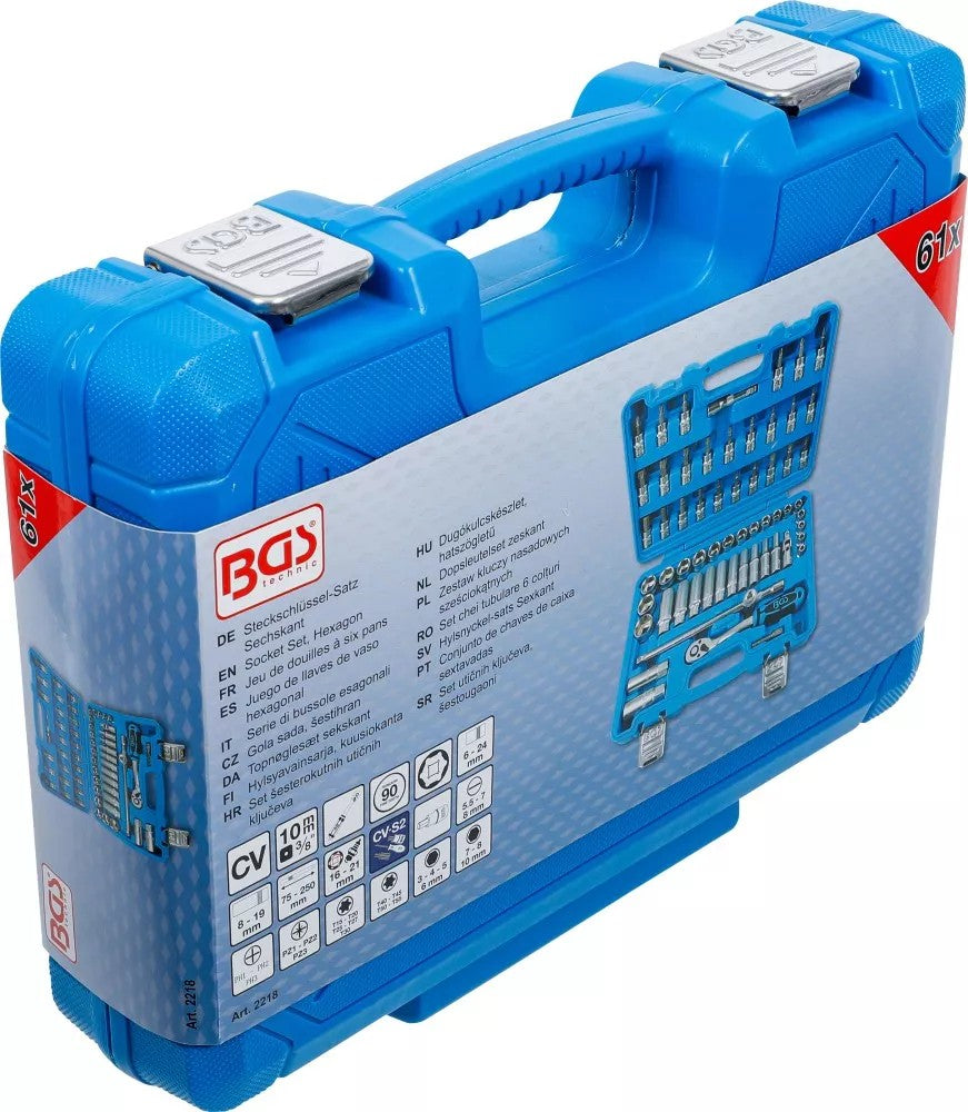 Profesionalių įrankių rinkinį BGS Technic 2218 sudaro 61 vnt. PRO+ klasės įrankių, pagamintų iš chromo vanadžio (CrV) plieno lydinio. Komplekte yra 3/8" šešiakampių HEX galvučių rinkinys, 72 dantų lenktas reversinis terkšlinis raktas su patogia ergonomiška rankena, įpresuotų antgalių komplektas, prailgintuvas, universali (kardaninė) jungtis ir kiti elementai. Įrankiai patogiai sudėlioti kompaktiškame lagamine. Šios konfigūracijos profesionalių įrankių rinkinys tinka surinkimo darbams, automobilių remontui bei kitiems darbams namuose ar dirbtuvėse.