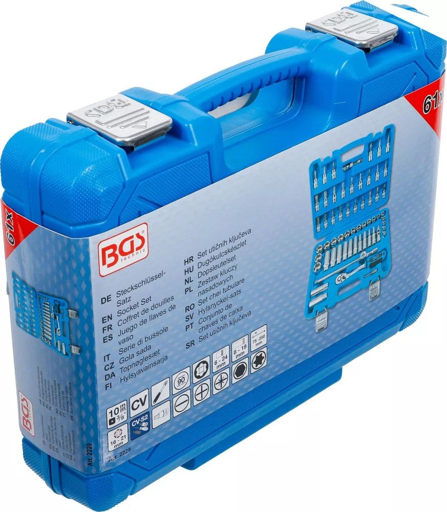 Profesionalių įrankių rinkinį BGS Technic 2229 sudaro 61 vnt. PRO+ klasės įrankių, pagamintų iš chromo vanadžio (CrV) plieno lydinio. Komplekte yra 3/8" šešiakampių HEX galvučių rinkinys, 72 dantų lenktas reversinis terkšlinis raktas su patogia ergonomiška rankena, įpresuotų antgalių komplektas, prailgintuvas, universali (kardaninė) jungtis ir kiti elementai. Super Lock banguoto profilio (wawe profile) galvutės pasižymi mažesniu praslydimu, geriau priglunda ir leidžia sukimo momento jėgą nukreipti į veržlės sienelę. Įrankiai patogiai sudėlioti kompaktiškame lagamine. Šios konfigūracijos profesionalių įrankių rinkinys tinka surinkimo darbams, automobilių remontui bei kitiems darbams namuose ar dirbtuvėse.
