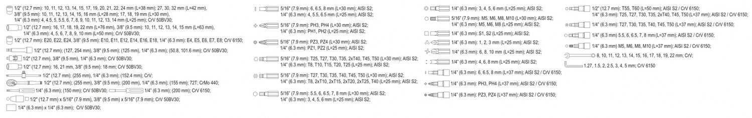 Įrankių rinkinys | 6.3 mm (1/4") / 10 mm (3/8") / 12,5 mm (1/2") | 216 vnt (YT-38841) yra užsakomoji prekė, ją išsiųsime per 3-4 savaites.